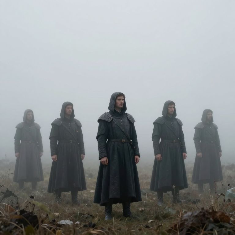 Photograph of four hooded, armored figures in dark, long coats standing in a foggy, desolate field, with a central figure in focus