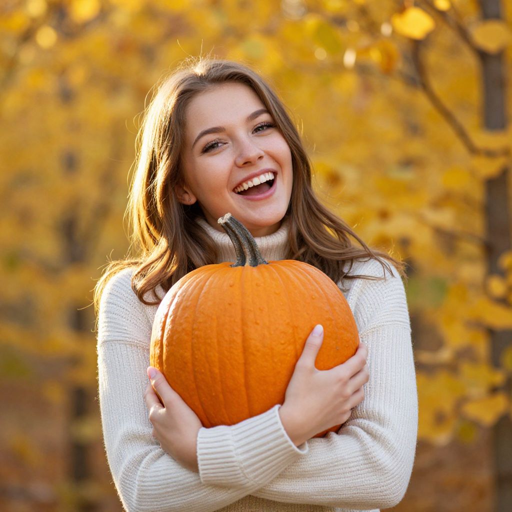 Radiant joy and the warmth of autumn intertwine as a young woman cradles a vibrant pumpkin, her laughter echoing through the golden leaves, embodying the transient beauty of the season.