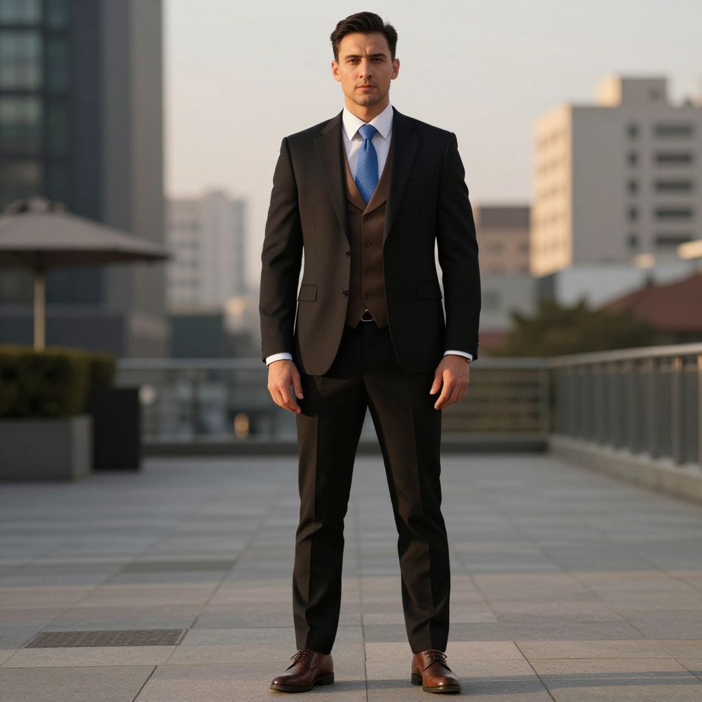 A well-dressed man stands confidently in a modern urban setting, wearing a brown wool jacket with a subtle pattern, black tailored pants, and a crisp white bow tie that adds a touch of elegance and sophistication. His dark hair is neatly styled, and he has a composed, approachable expression, exuding professionalism and charm. The background features a city skyline at golden hour, with soft sunlight casting warm highlights on his outfit and the surrounding buildings.