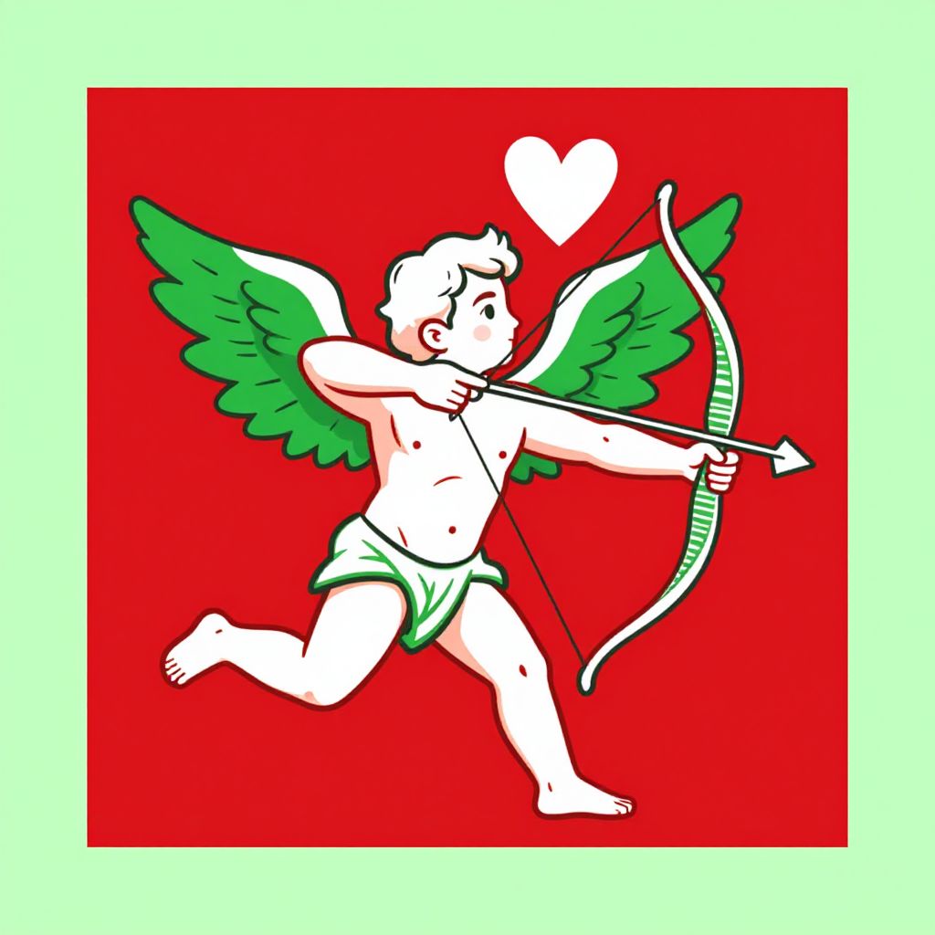 A digital illustration of a cherubic Cupid with green wings and a white, curly-haired head, drawn in a simplistic, cartoon style. He is depicted mid-air, drawing a green and white striped bow and arrow, aimed to the right. Cupid is shirtless, wearing only green briefs, with a small white heart floating above his head. The background is a solid, vibrant red, contrasting with the green and white of Cupid's wings and bow. The illustration is bordered by a thin, light green frame. The overall style is playful and whimsical, evoking classic Cupid imagery.