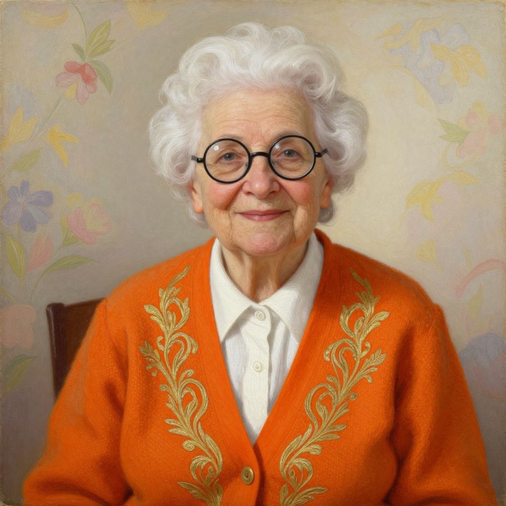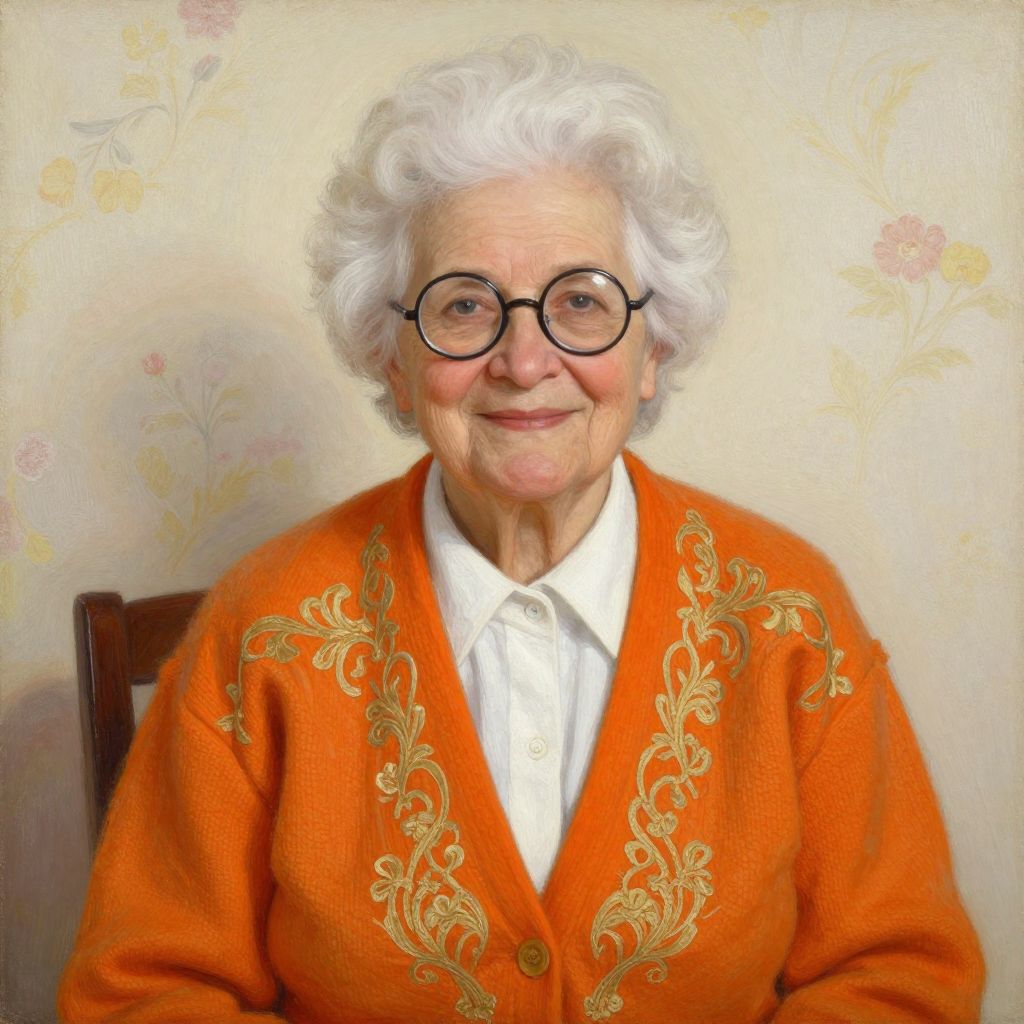 Photograph of an elderly woman with fair skin and white, curly hair, wearing round black glasses. She is dressed in an orange knitted cardigan adorned with intricate gold embroidery along the front and sleeves, over a white button-up shirt. She has a gentle smile and is seated against a beige, floral-patterned wallpaper backdrop. The image is brightly lit, highlighting her warm expression and the textures of her clothing. She is sitting on a dark wooden chair.