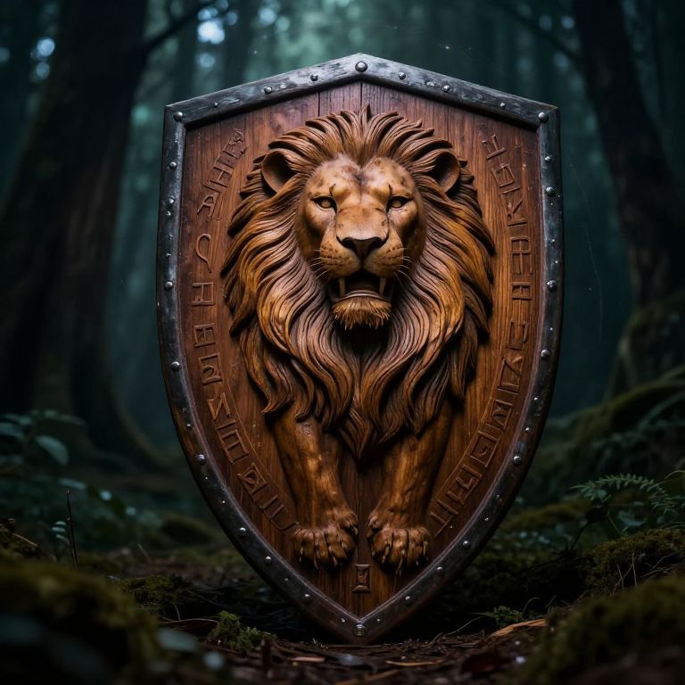 Lion shield protection concept, powerful lion carved into a sturdy wooden shield, surrounded by mystical runes and protective magic aura, standing in a dark enchanted forest, cinematic atmosphere, rich textures, fantasy art