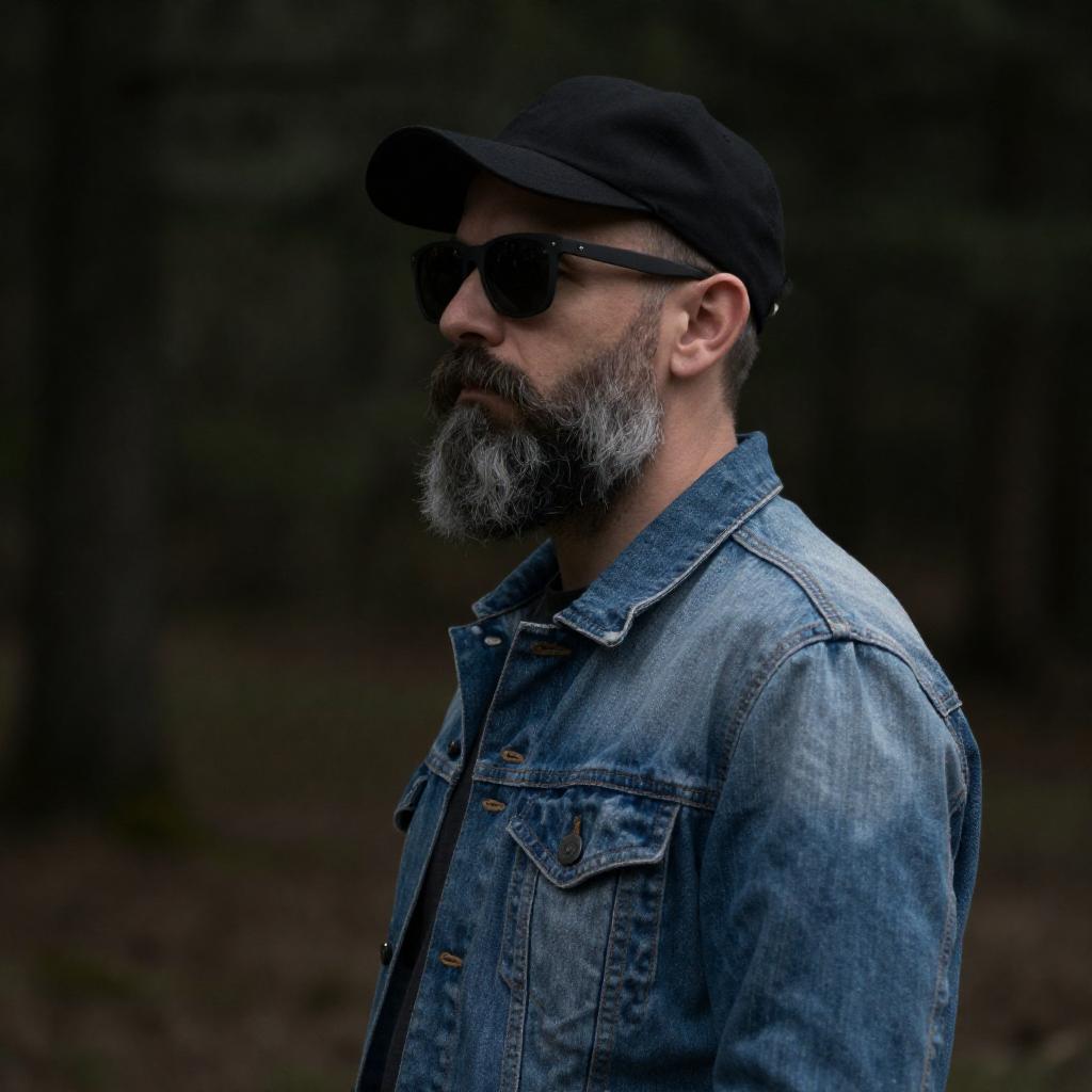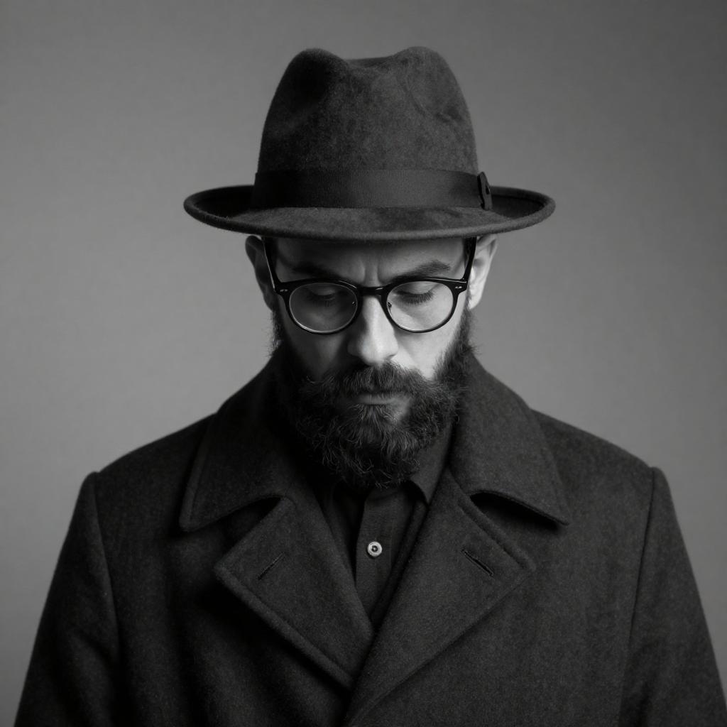 Black and white photograph of a bearded man with a dark mustache, wearing a wide-brimmed hat and a ured coat with a fringed scarf. He has a serious expression, standing in a foggy, industrial setting with metal beams in the background. The man is centered, looking slightly to the left.