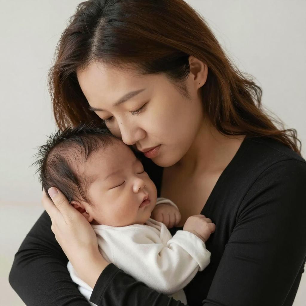 Photograph of an Asian woman with long, wavy brown hair, wearing a black long-sleeve top, cradling a sleeping newborn with short dark hair. The baby is naked, snuggled against her chest. Soft, natural lighting highlights their faces. The camera angle is slightly above eye level, focusing on the subjects with a shallow depth of field, blurring the white background. Her expression is gentle and caring.