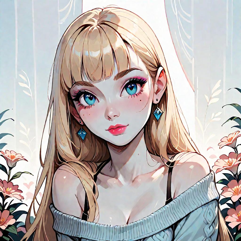 Score_9, score_8_up, score_7_up, score_6_up, score_5_up, score_4_up, cute girl, large blue eyes, long eyelash, narrow eyebrow, small nose bridge, long hair, blonde, blunt bangs, innocent, off shoulder sweater, pale skin, fullbody, blooming flowers, bathed in dynamic lighting, earrings, extremely detailed CG unity 8k wallpaper