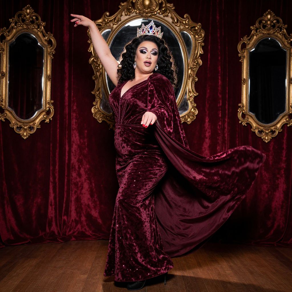 Elegant bbw drag queen wearing a flowing velvet cape and glittering crown, performing a cabaret dance under soft spotlight, surrounded by vintage mirrors and red velvet curtains, rich textures and warm lighting, theatrical and majestic mood.