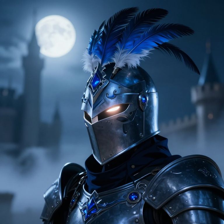 Digital artwork of a medieval knight in shiny, blue-tinged steel armor with a helmet adorned with black and blue feathers. The knight's visor glows with a bright, white eye slit. The background is a misty, blue-lit night scene featuring a full moon and blurred castle towers. The armor is detailed with blue gemstones, adding a regal touch. The overall color palette is dominated by blues and blacks, creating a mysterious, ethereal atmosphere. The knight's stance is imposing and heroic.