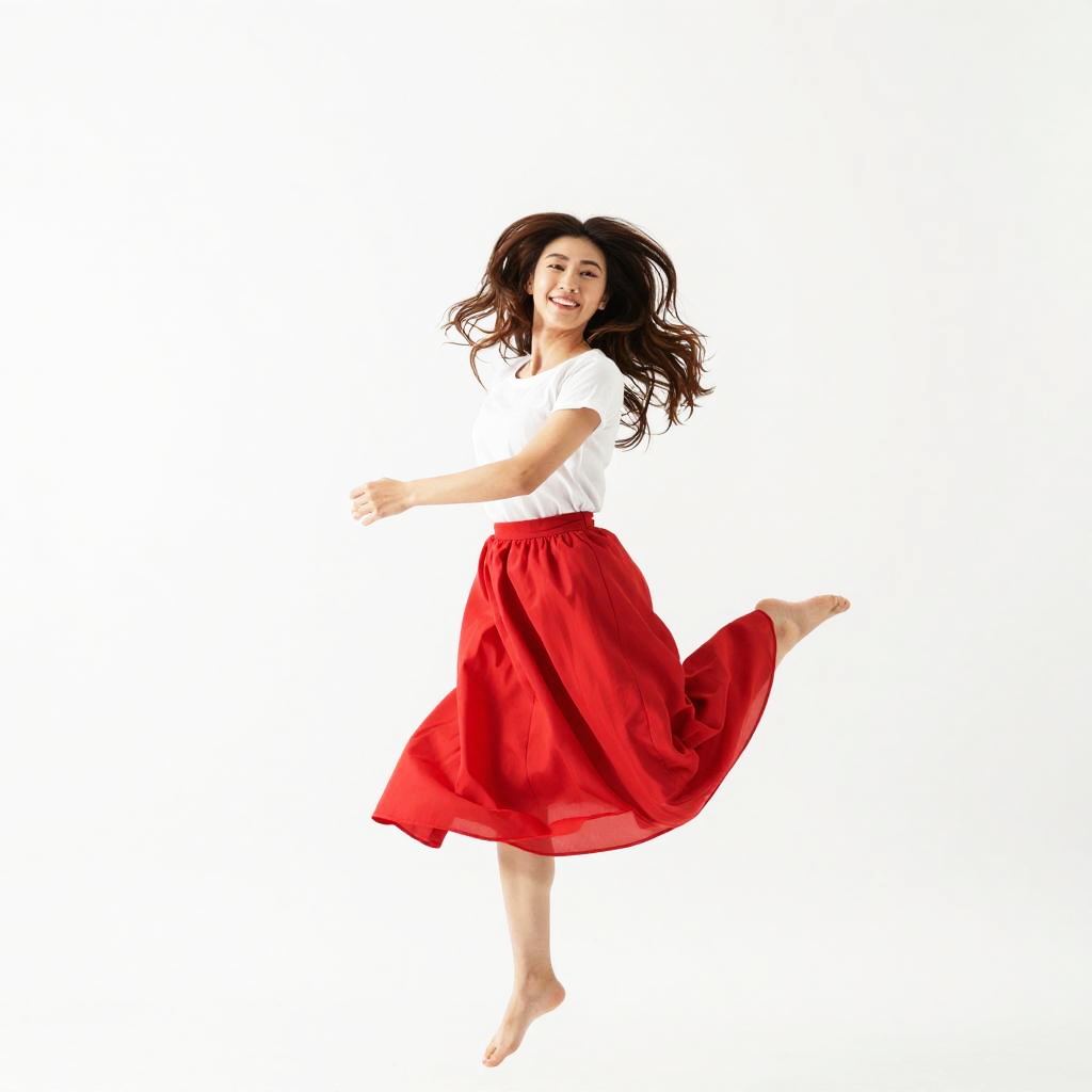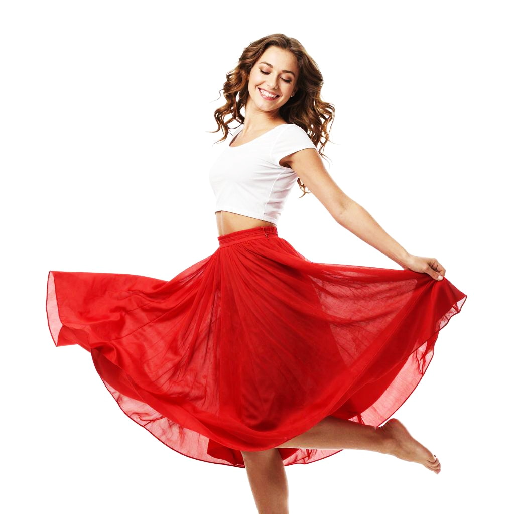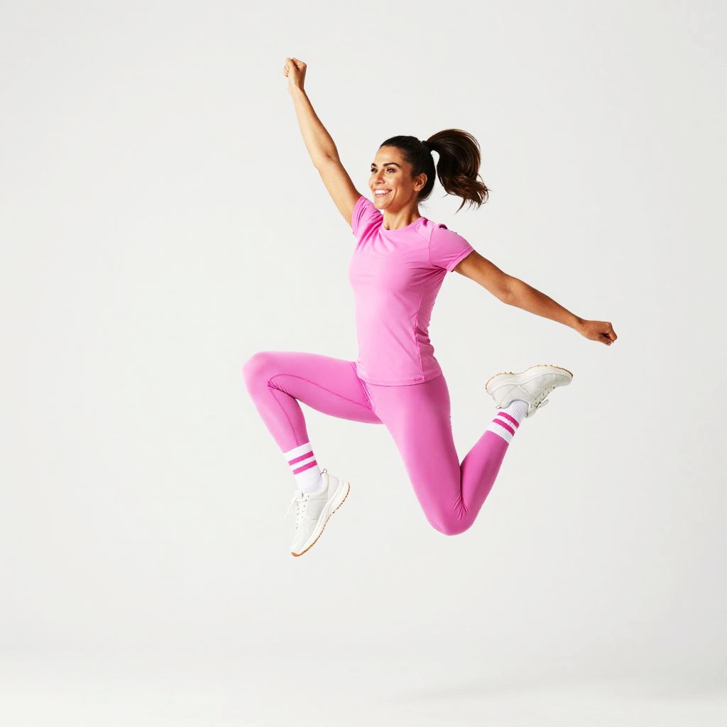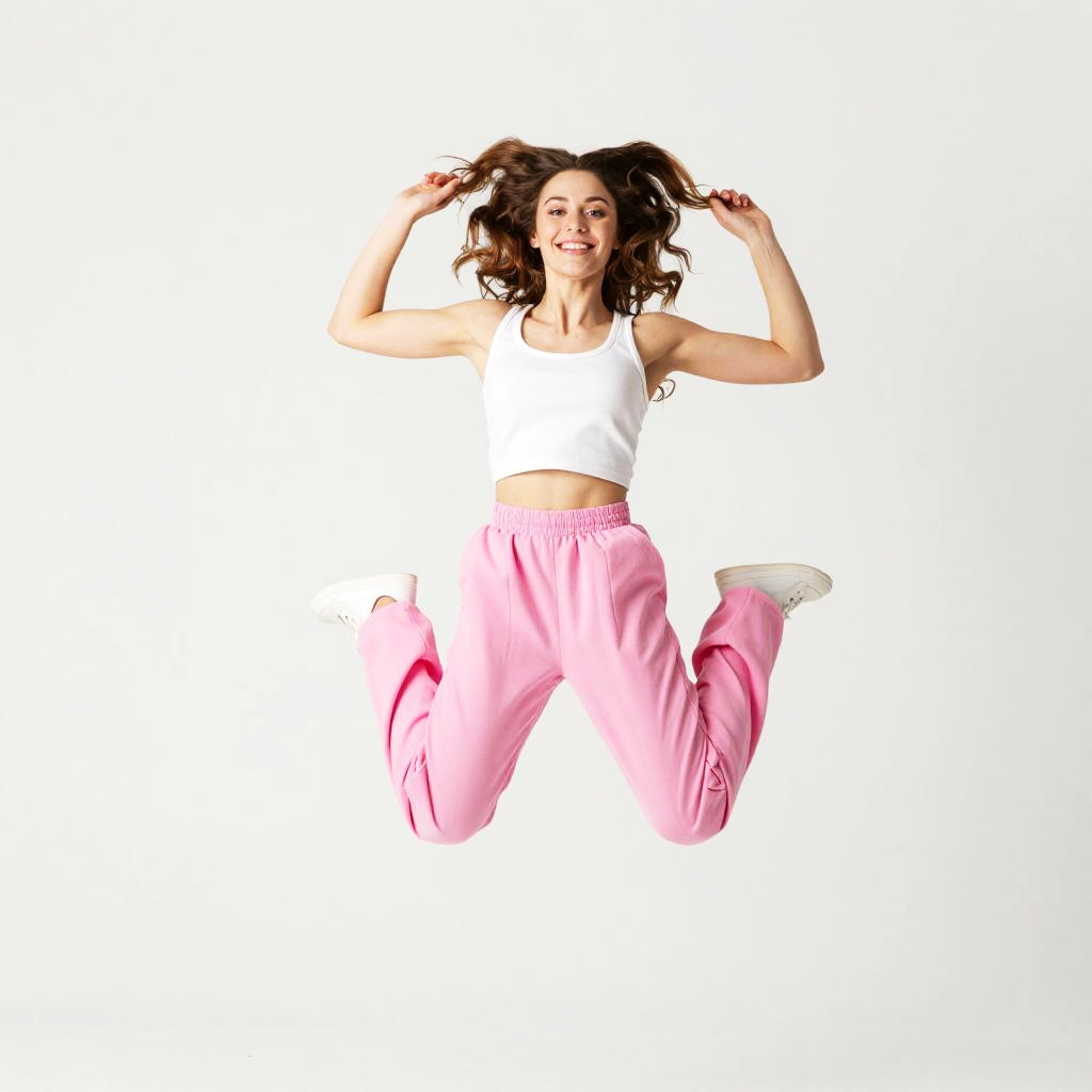 Photograph of a smiling woman with long brown hair, wearing a white crop top and bright pink, semi-transparent, flowing pants. She's mid-air, with one hand touching her hair and the other near her face, against a stark white background. Her expression is joyful, and the pants add a playful, vibrant contrast to her outfit.