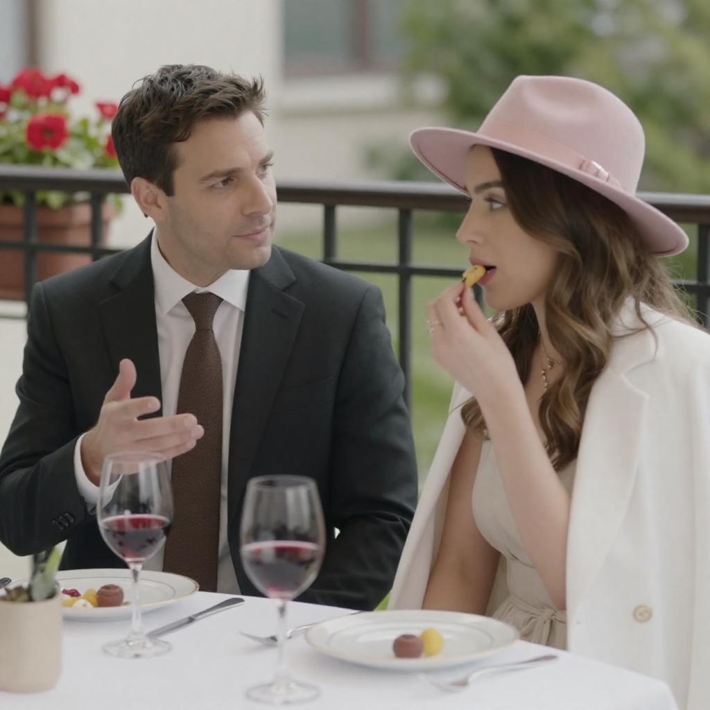 Photograph of a man and woman at an outdoor table. Man in black suit, brown tie, white shirt, holding a wine glass, gesturing with right hand. Woman in pink hat, white coat, beige dress, eating with right hand. Table with red wine, plates, glasses, silverware. Background: iron railing, red flowers, green plants. Man's short dark hair, woman's light brown hair. Both seated, man on left, woman on right.