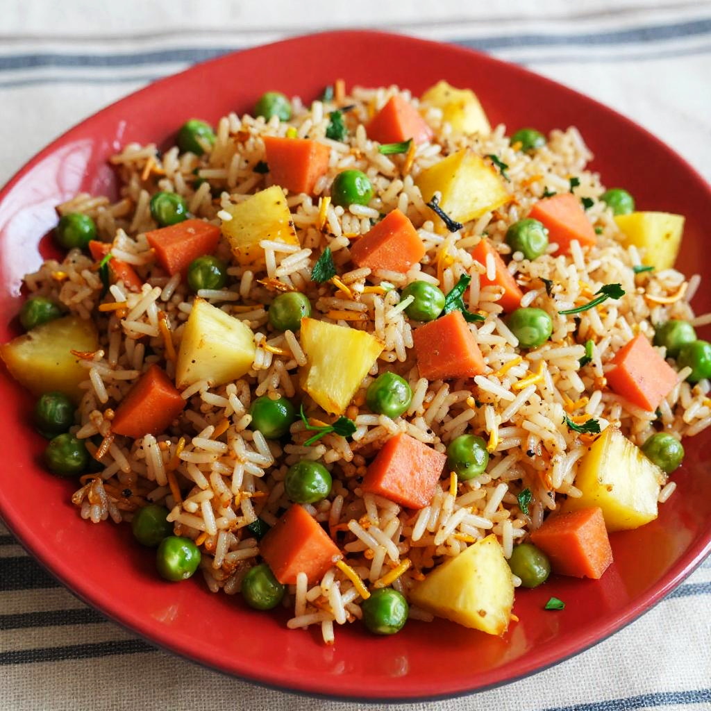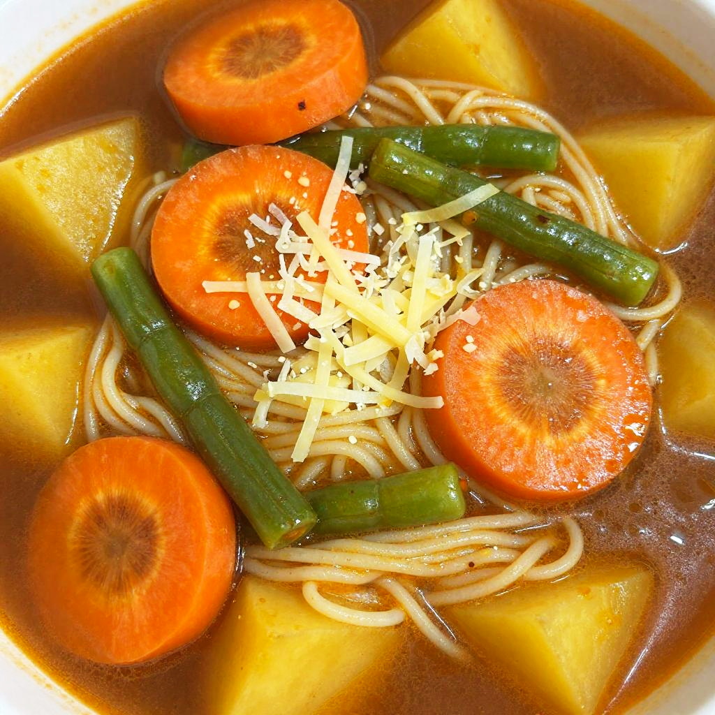 A close-up photograph of a spoon holding a vibrant green pickled cucumber slice, a bright orange carrot slice, and a yellow potato chunk. The background is a blurred, golden-brown stir-fry with visible pieces of green vegetables and orange chunks. The spoon is shiny silver, and the food looks freshly cooked and colorful. The image has a warm, appetizing feel.