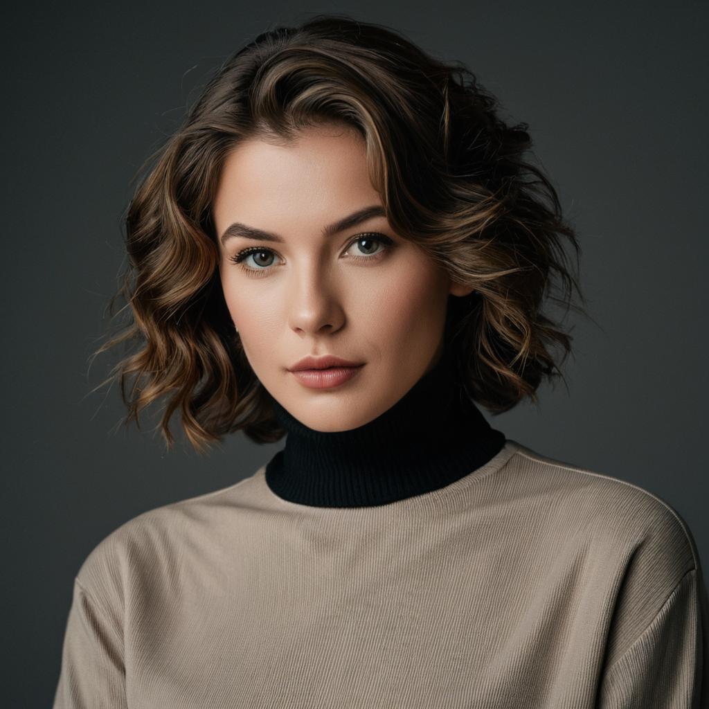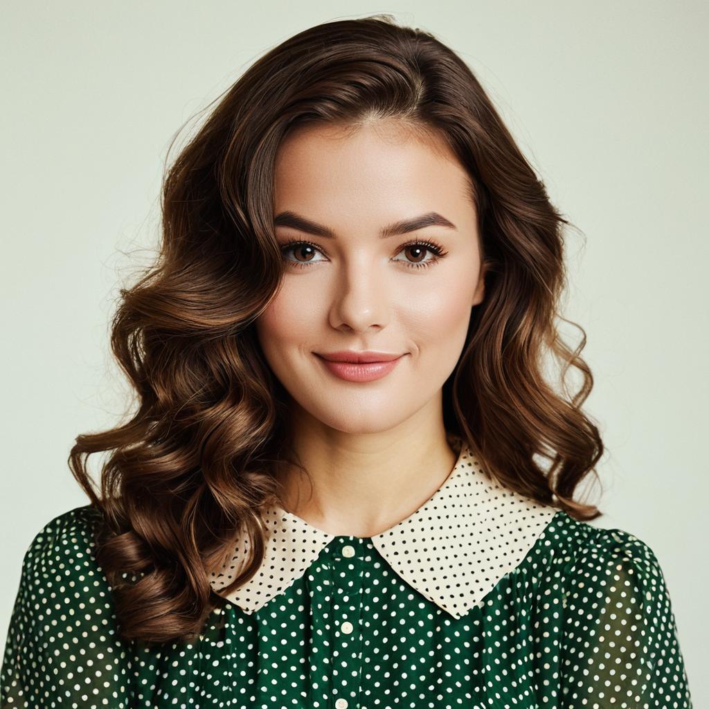 Photorealistic studio portrait of a young woman with light skin and long wavy brown hair. She is wearing a green polka dot sheer blouse with a contrasting beige collar featuring smaller brown polka dots. The woman has green eyes, softly smiling with detailed facial features against a neutral background with soft lighting.