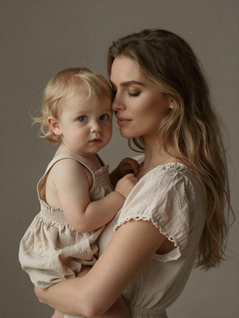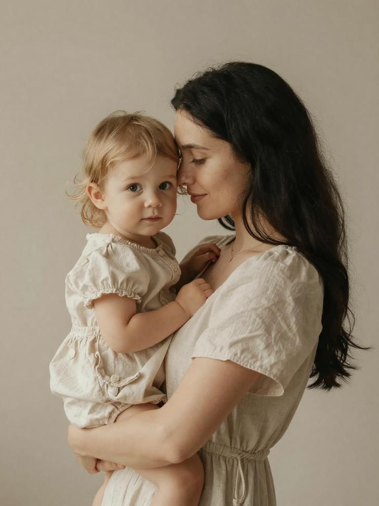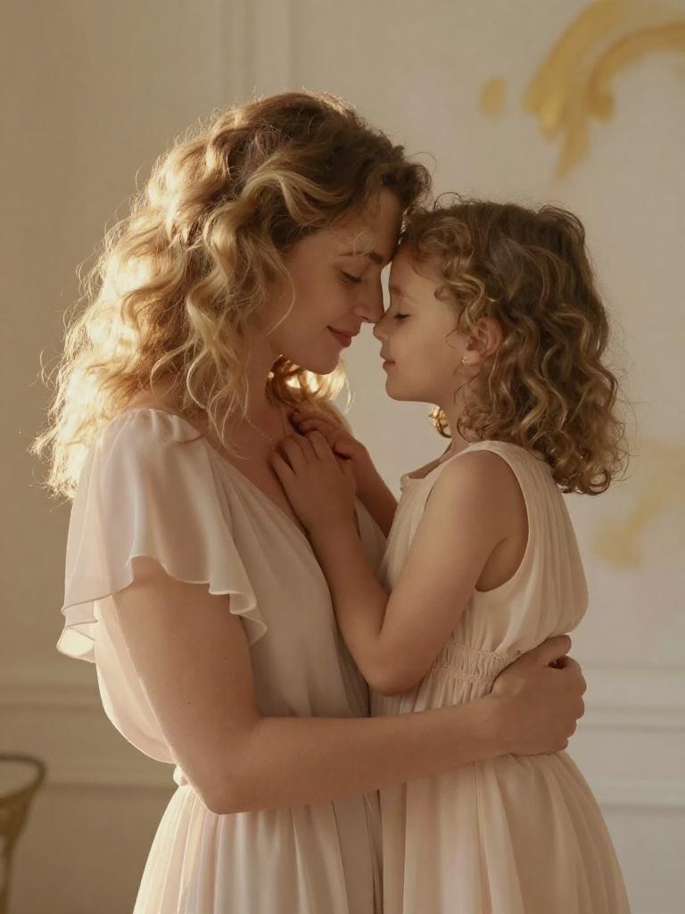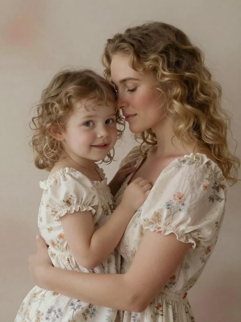 Mother and daughter, tender close embrace, mother with loose blonde curls and sun-kissed complexion gently holding little girl with short curly hair and dimpled cheeks, faces touching, eyes mother’s eyes closed, child looking at the viewer, both wearing soft pastel linen dresses with delicate ruffles, bathed in creamy softbox-style light with minimal shadows with creamy gradient background with subtle texture, soft dreamy focus, emotional fine-art portrait, high resolution, ultra-detailed