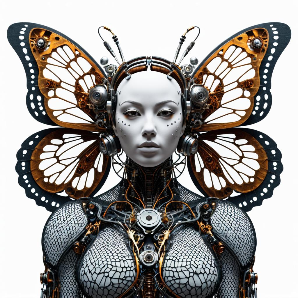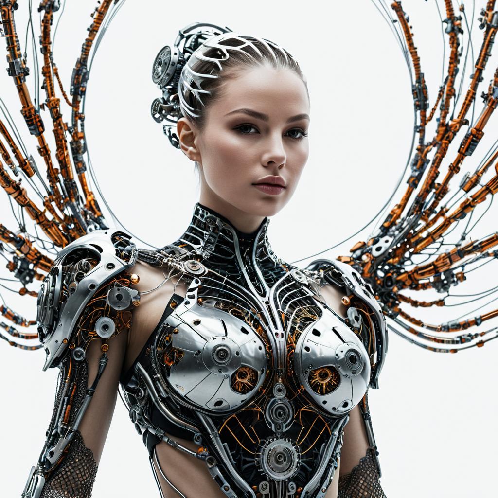 Complex 3D render, ultra-detailed portrait of a elegant female cyborg ballerina with mechanical cyborg elements, abundant natural soft light, intricate details, autumn-themed colors, white background, mesh wire, mandelbrot fractal, anatomical, avant-garde inspired by Iris van Herpen, hyperrealistic, octane render, H.R. Giger style, 8K