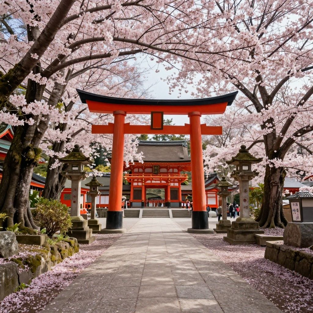 Photograph of a traditional Japanese torii gate with bright red columns, surrounded by blooming cherry blossom trees, stone lanterns, and red shrine buildings
