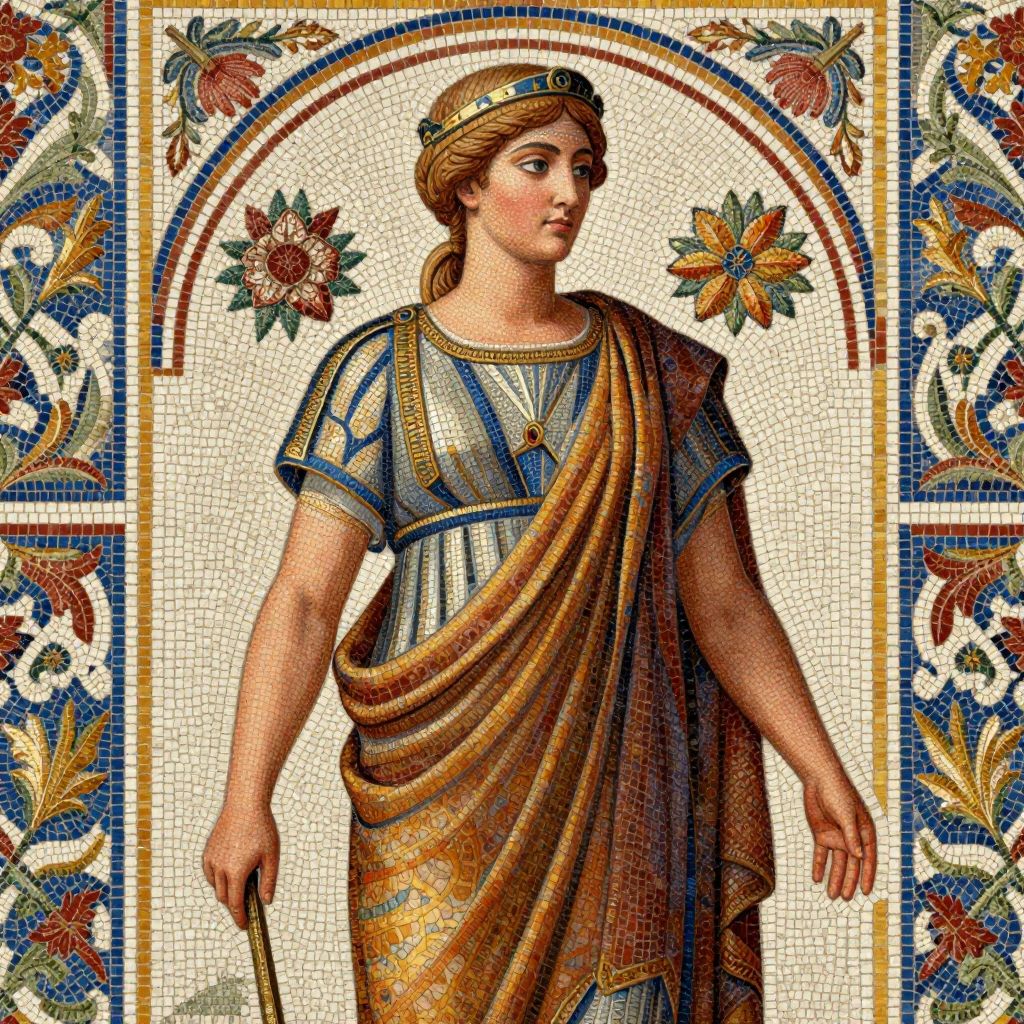 Mosaic artwork of a classical Roman woman with brown hair, wearing a gold and blue toga, holding a staff, surrounded by floral patterns and a