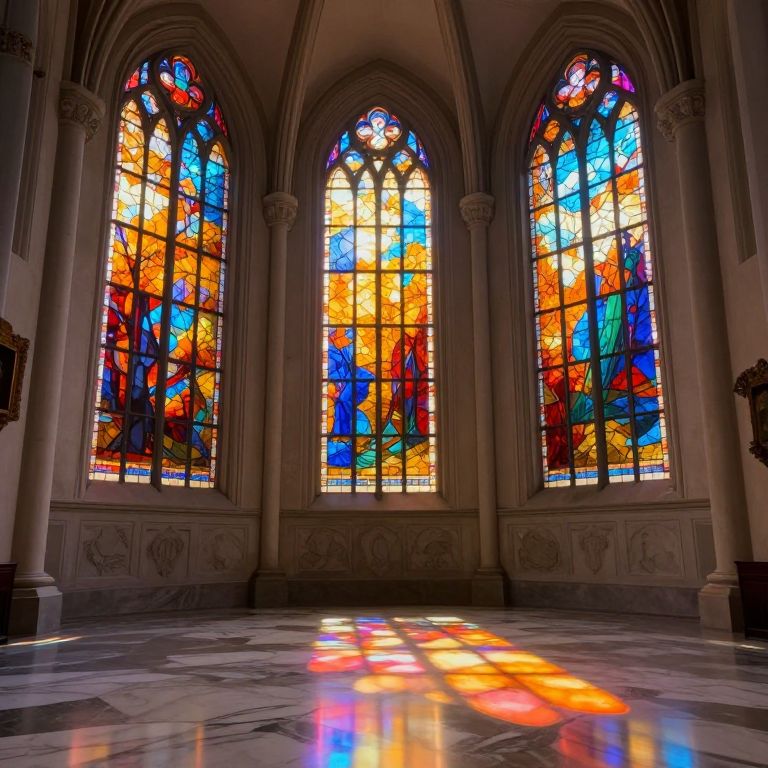 A grand cathedral interior features towering arched stained-glass windows bathed in vibrant autumn hues, casting dynamic reflections on the polished marble floor, evoking a surreal, otherworldly atmosphere reminiscent of a digital art rendering.