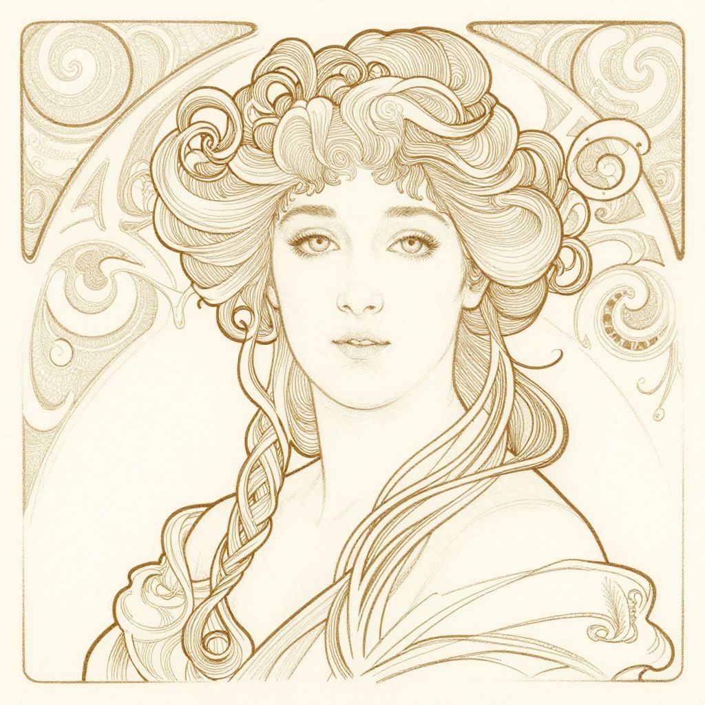 The image is a continuous ink line sketch of a beautiful woman, reminiscent of the works of Alphonse Mucha and Gustav Klimt. The woman's face is adorned with perfect eyes and an upturned nose, exuding elegance and grace. Her hair, styled in intricate curls, cascades down in a braid, adding to her regal appearance. The background features swirling, abstract patterns that complement the woman's serene expression. The overall composition is balanced, with the woman's face centrally positioned and the swirling patterns creating a sense of movement and depth. The sketch is meticulously detailed, capturing the essence of the subject with precision and artistry.