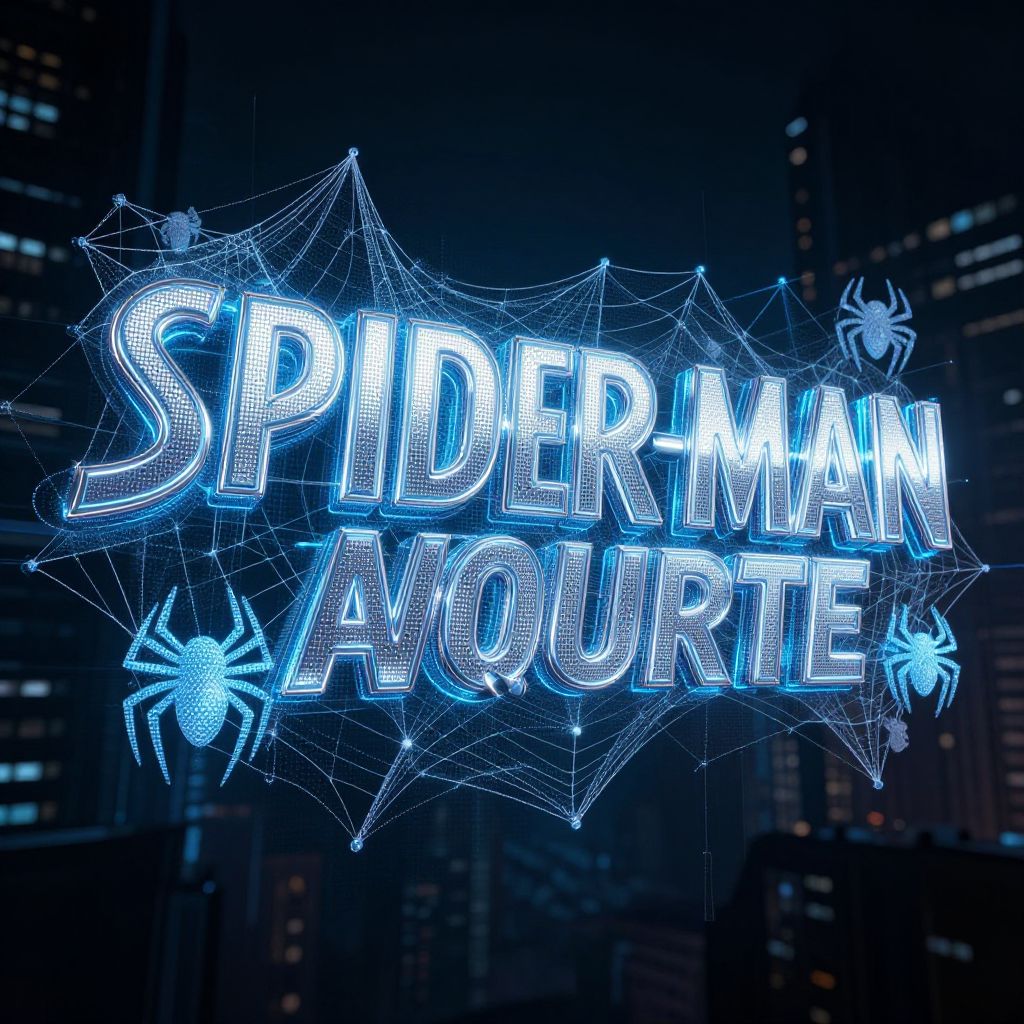 Spiderman text designed as futuristic digital display, holographic 3D letters with metallic texture, surrounded by web patterns and spider silhouettes, cyberpunk cityscape background, dark moody tones with bright electric blue highlights, sleek and modern style