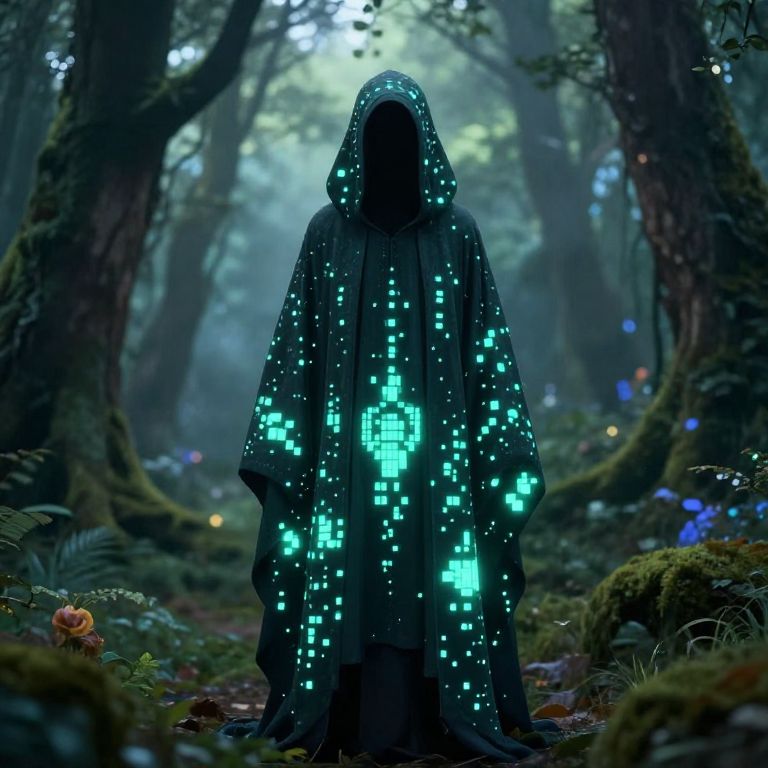 Pixel cloak draped over a mysterious figure in an enchanted forest, with glowing pixelated patterns blending into the environment, soft magical lighting and a misty atmosphere