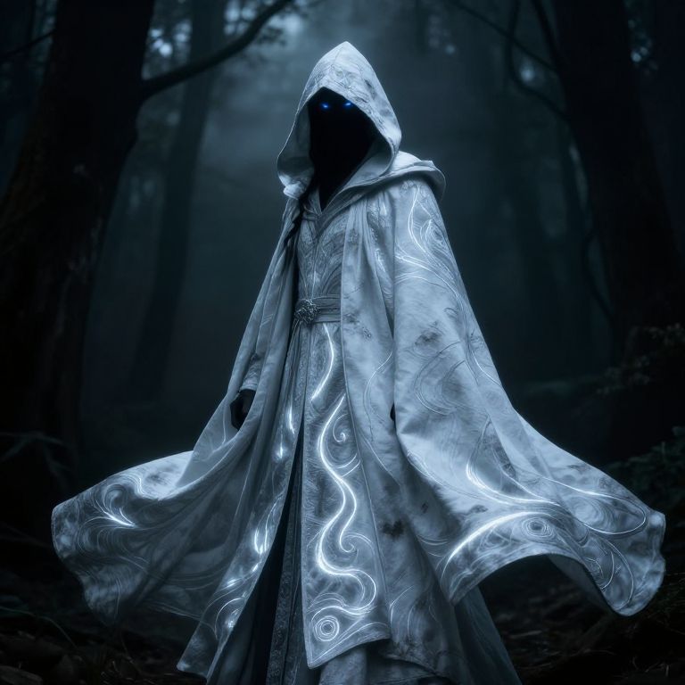 Mysterious figure in glowing, pixelated, dark hooded cloak stands in enchanted forest; misty background with trees and blue flowers. Digital art.