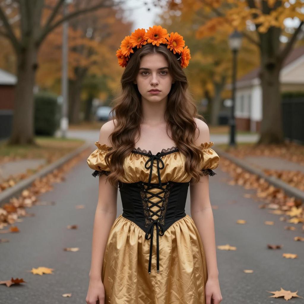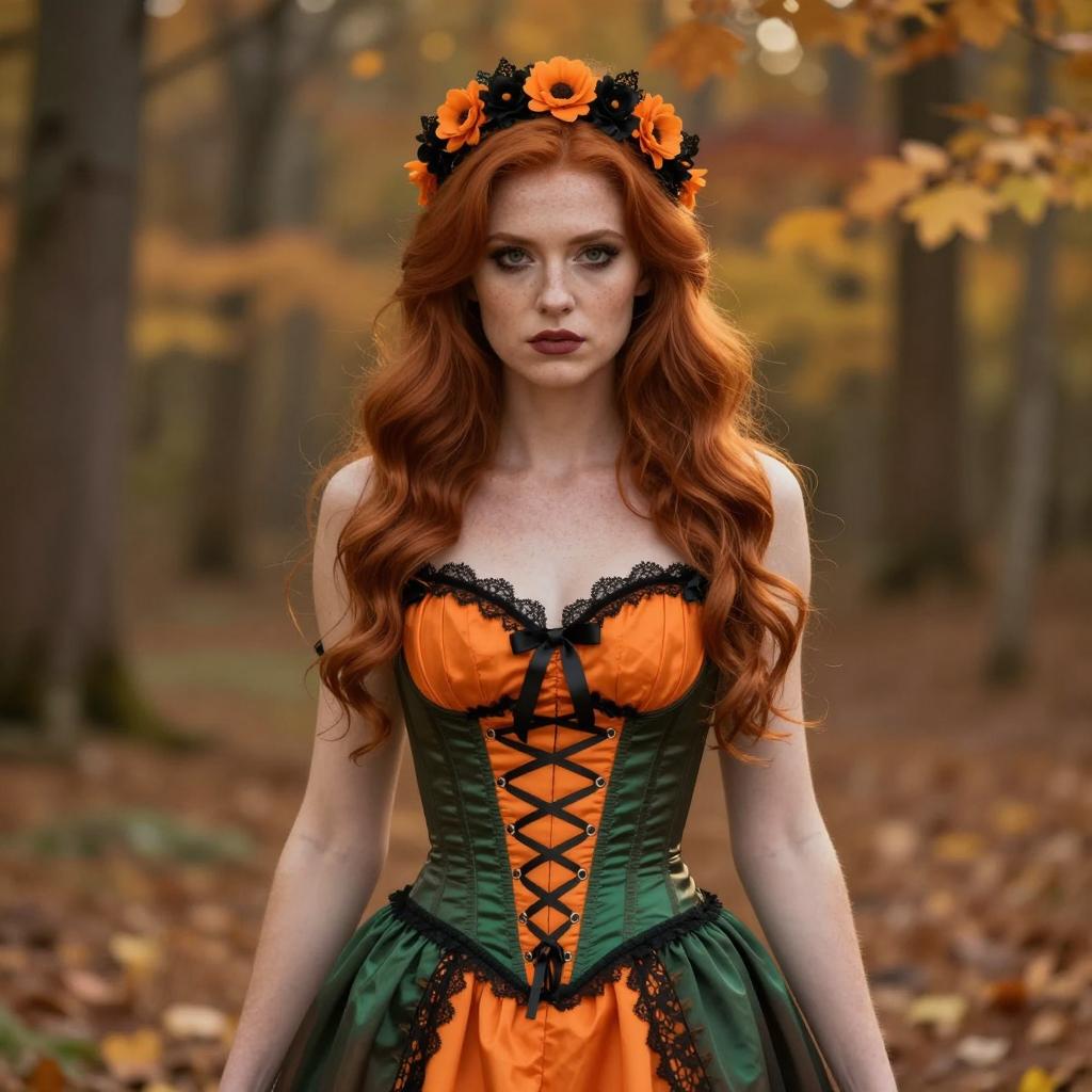 Usa made halloween costume, photorealistic, young woman, autumn forest background, brown off-shoulder corset dress with gold lace trim, brown and tan colors, small orange pumpkin in right hand, long wavy brown hair, orange flower crown, serious expression, blurred trees and fallen leaves in background, natural light, high detail, cosplay or Halloween theme, shallow depth of field, realistic ures, female, attractive, fantasy costume, fall season, standing, holding pumpkin, forest setting