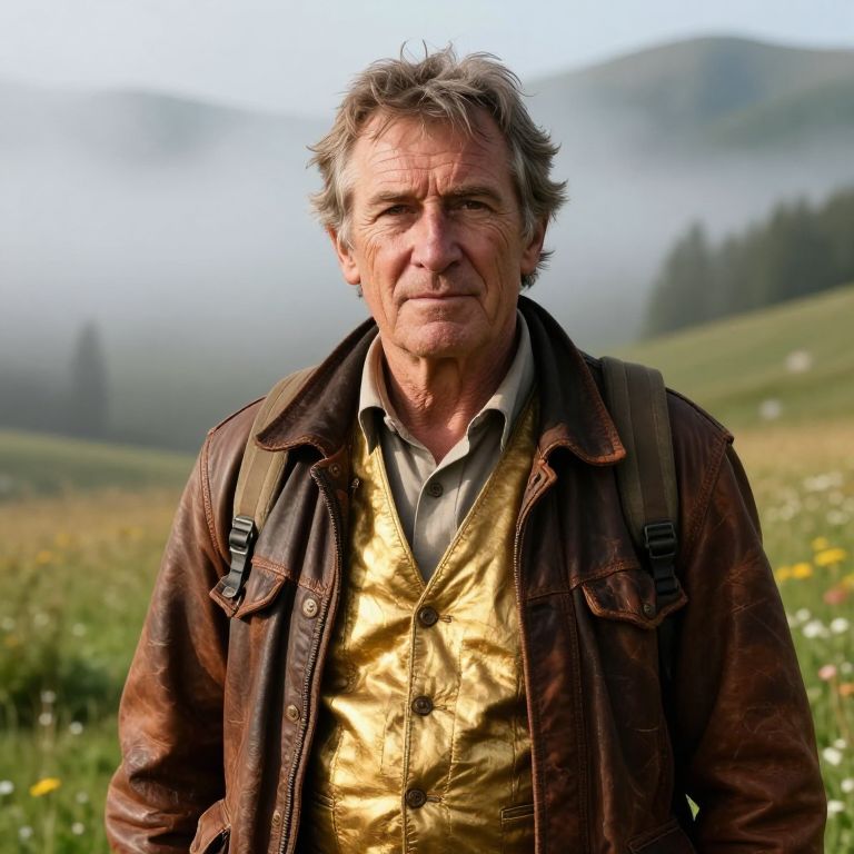 Cousin Eddie blue suit, a quirky man in a slightly oversized vibrant blue suit standing in a rustic RV park, surrounded by vintage trailers and pine trees, with a playful smile and weathered charm, vibrant colors, cinematic lighting
