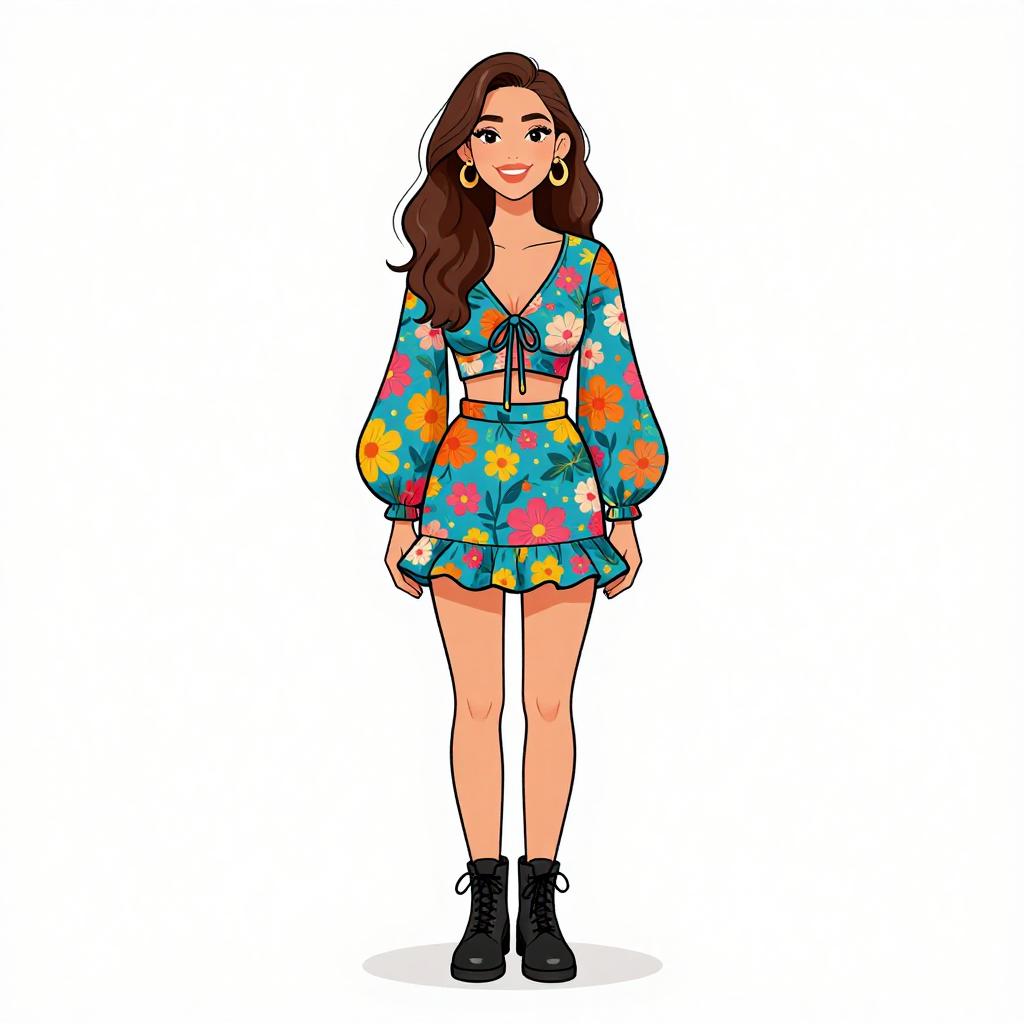 Digital illustration of a smiling woman with long brown hair, wearing a colorful floral crop top and skirt, black ankle boots, and large hoop earrings, standing