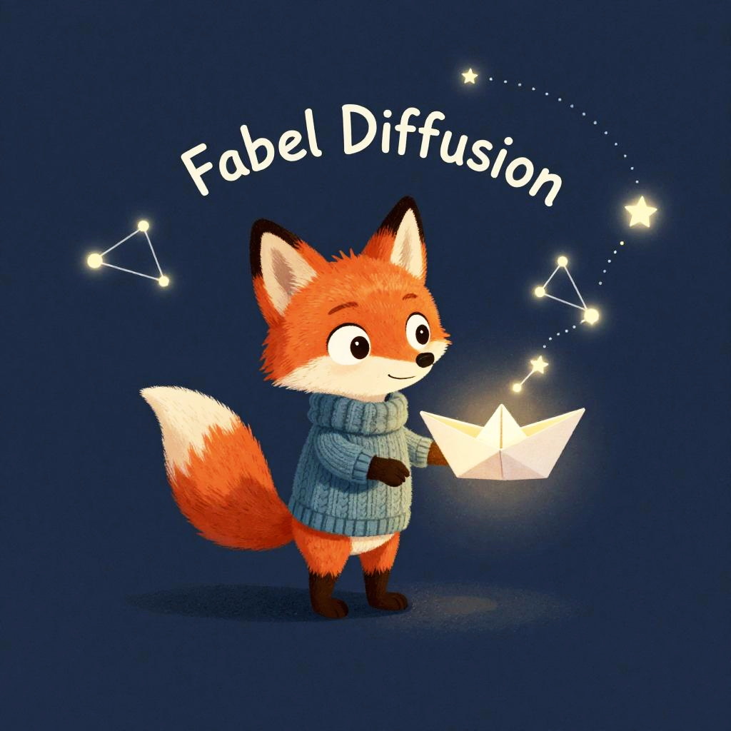 Imagine a captivating book cover featuring a wide-eyed little fox in a hand-knit sweater radiating wonder. The illustration should include a glowing origami boat trailing tiny constellations sketching whimsical shapes around the book. The book must appear magical, suggesting that its stories resonate deeply with the child's interests. Use a vibrant color palette and a playful, cartoonish style to appeal to both children and their parents. This artwork will be showcased on the Fabel Diffusion website, highlighting the charm of personalized storytelling.