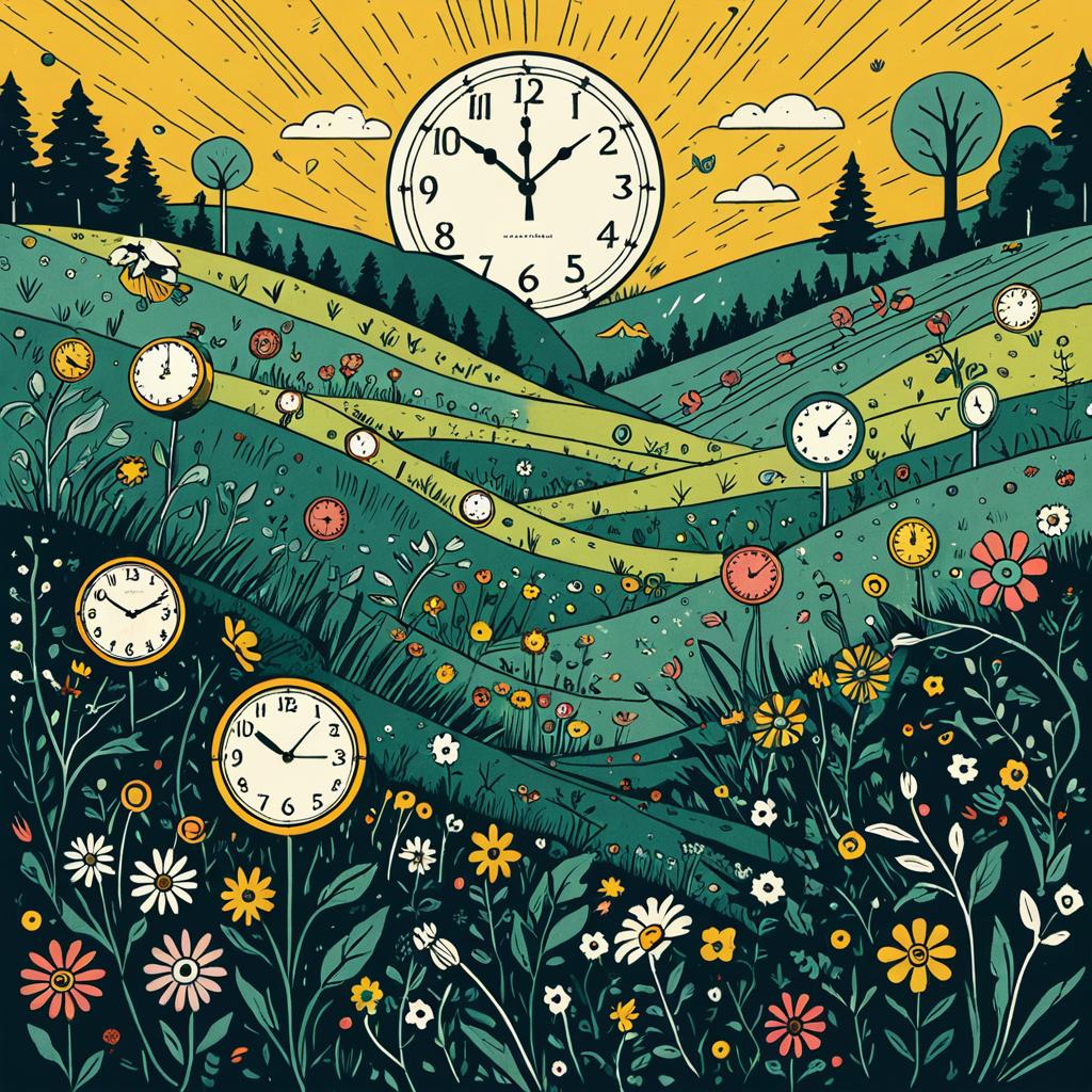 Close-up illustration of numerous clock gears and watch faces with Roman numerals, intricately interconnected and overlapping in a swirling, vortex-like composition. The image combines playful and dreamlike mechanical sketches with a realistic color palette, showcasing the juxtaposition of hard metallic gears and softer imaginative floral elements.
