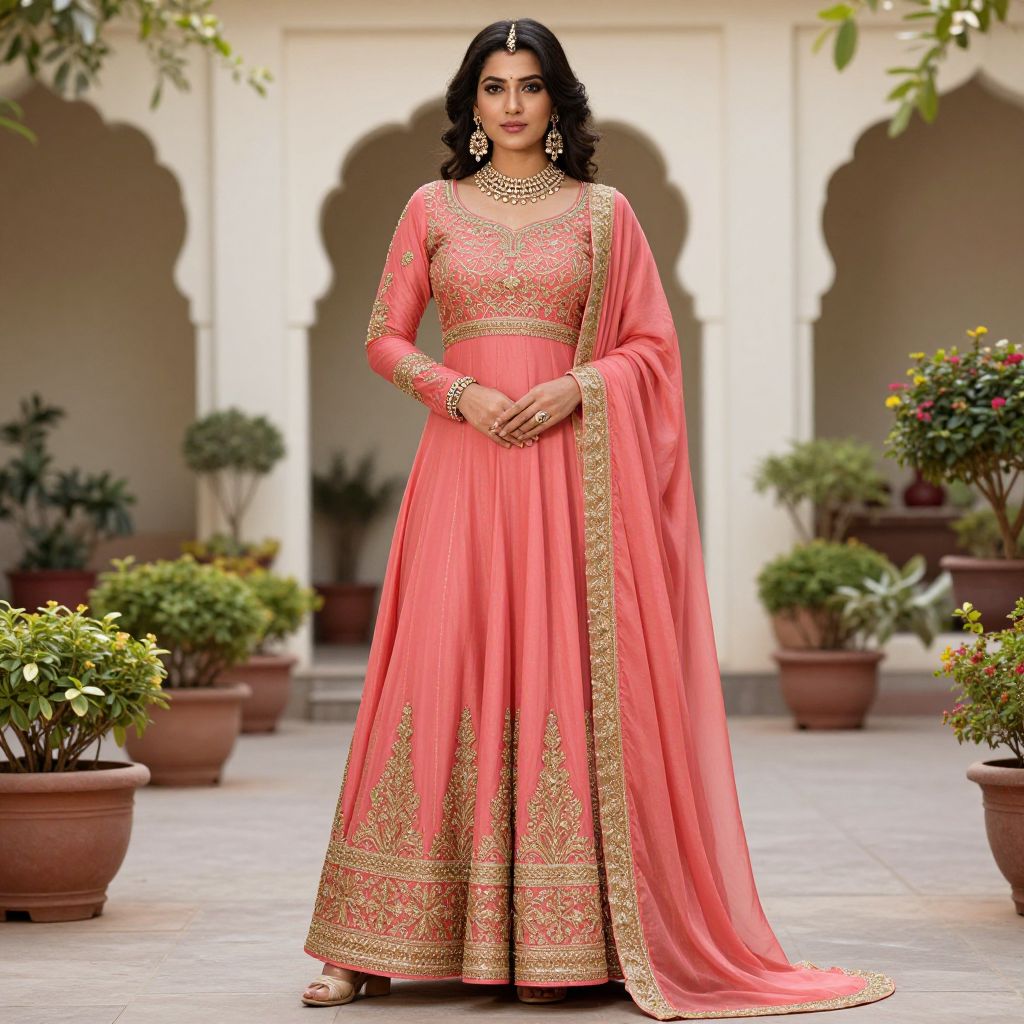 Elegantly poised woman wearing a vibrant rose-colored Indian dress with intricate gold embroidery, complemented by ornate jewelry, stands gracefully amidst a serene garden setting featuring potted plants and architectural arches.