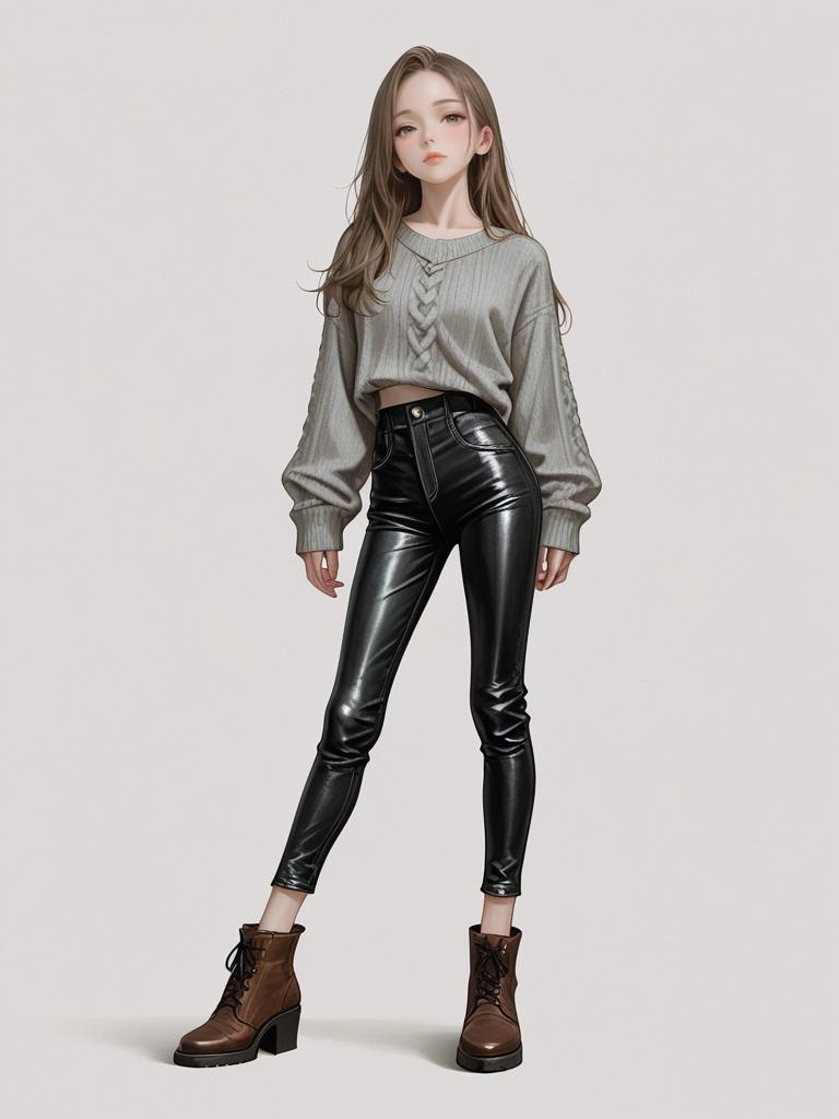 Photograph of a young woman with long brown hair, wearing a grey sweater, black shiny leather pants, and brown ankle boots, standing against a white