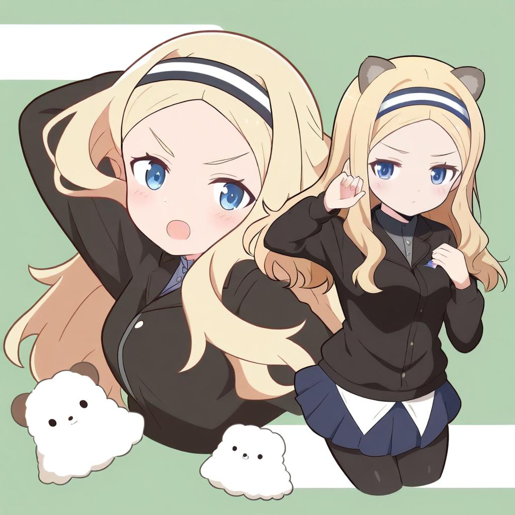 Aleksandra i. pokryshkin, brave witches, 1girl, bear girl, bear ears, blue eyes, blonde hair, long hair, hairband, military uniform, black pantyhose, by artist gomashio (goma feet), animagine