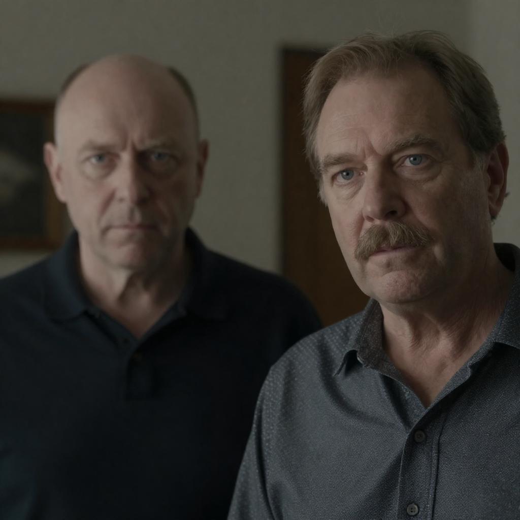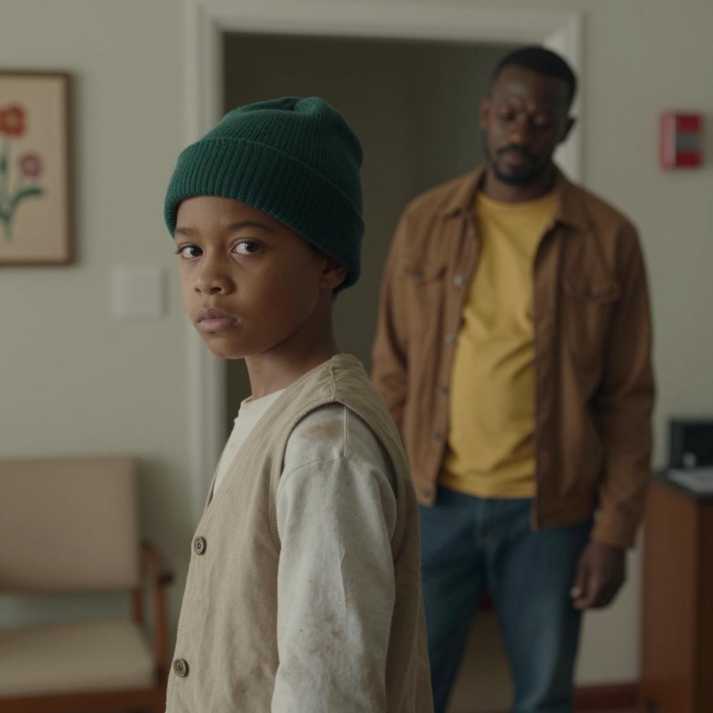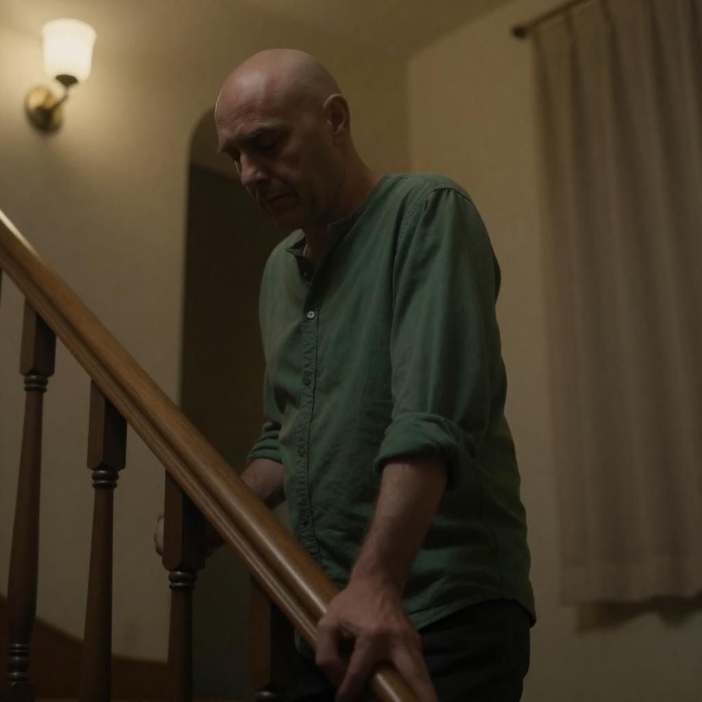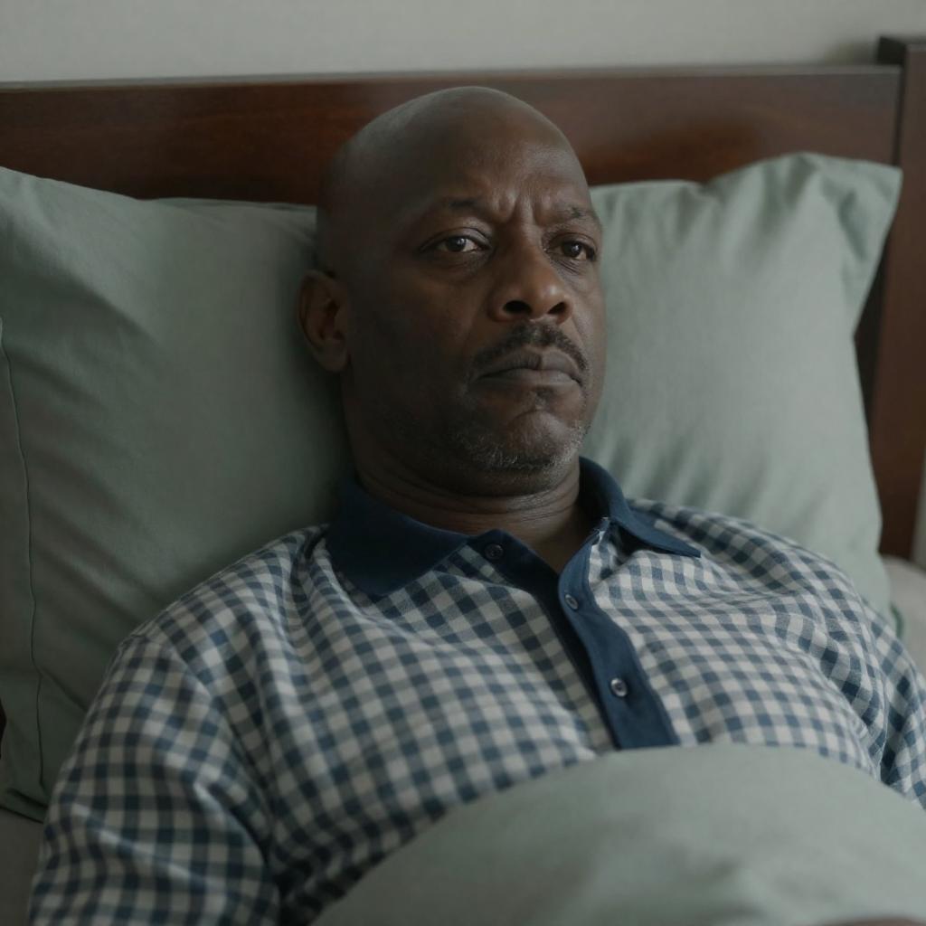 Photograph of a bald, middle-aged African-American man with a serious expression, lying in bed with green pillows. He wears a blue and white checkered shirt with a dark collar. Background includes a wooden headboard and dim lighting.