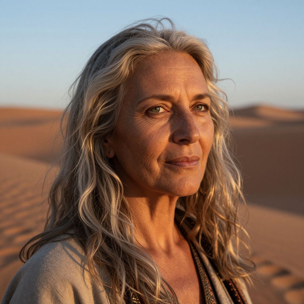 Photograph of an older woman with long, wavy, silver-gray hair, standing in a desert with sand dunes in the background. She has a tanned, wrinkled complexion and is wearing a light gray, textured top. Her expression is calm and slightly smiling, with warm sunlight highlighting her face and hair. The background features a clear, blue sky and reddish-brown sand dunes, with sunlight casting shadows on the sand. The image has a natural, candid style, emphasizing the woman's serene presence in the desert landscape.