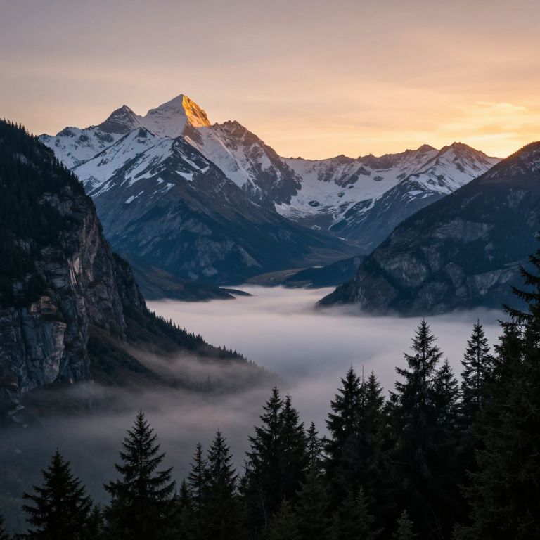 Dramatic peaks rise majestically above a serene valley blanketed in mist, their snow-capped summits bathed in the warm glow of a setting sun, while rugged cliffs and dense evergreen forests frame the tranquil scene below.