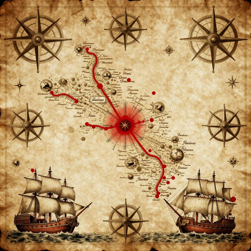 This digital illustration on aged, brown parchment features a nautical chart with a red, radiating starburst at the center. Surrounding the starburst are handwritten notes and small symbols. A winding red line snakes from the starburst to the bottom corners, where two detailed, black-and-white ships with billowing sails are anchored. The background is adorned with eight large, black compass roses, evenly spaced. The texture mimics old, weathered paper, adding a vintage, historical feel to the maritime-themed map. The style is reminiscent of 18th-century navigational charts.