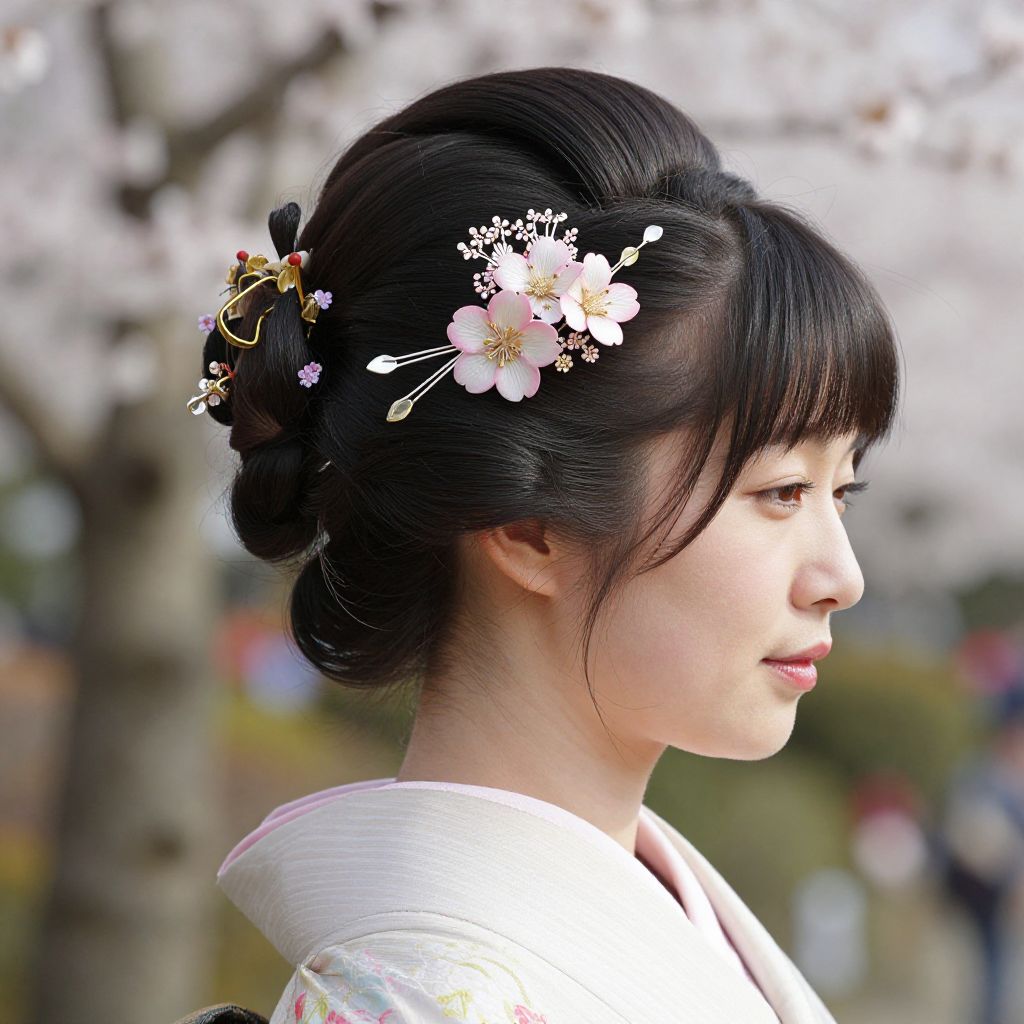Japanese woman hair style, traditional kimono setting, intricate hair ornaments with kanzashi flowers, soft natural lighting highlighting delicate features, serene garden background with cherry blossoms, detailed and elegant cultural representation.