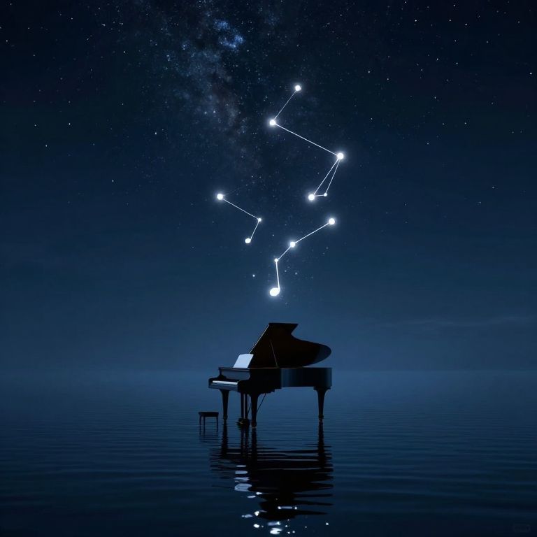 Digital artwork of a grand piano silhouetted against a deep blue, starry night sky. Bright, glowing stars and a constellation form a musical note shape above the piano. The piano, positioned slightly to the left, sits on calm, reflective water, with its reflection visible on the surface. A small stool is placed to the right of the piano. The image uses a monochromatic blue palette, emphasizing the serene, cosmic atmosphere. The constellation and stars are outlined in white, contrasting sharply with the dark background.