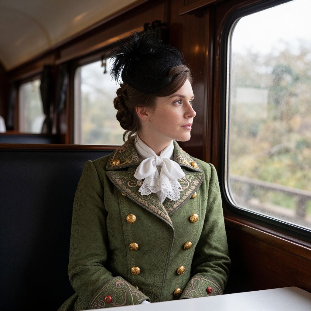 In this high-quality photograph, a woman is seated in a first-class Victorian train car, gazing out the window with a thoughtful expression. She is dressed in a detailed, period-appropriate outfit, featuring a green coat with gold buttons and intricate embroidery, a white ruffled collar, and a black hat adorned with a feather. Her hair is styled in an elegant updo, adding to the historical ambiance. The reflection in the window reveals the interior of the train car, with soft lighting and warm tones that enhance the realism of the scene. The overall composition is carefully arranged, with the woman positioned centrally, her body slightly turned to the side, creating a sense of depth and perspective. The photograph is shot on a DSLR Canon 5D, capturing the intricate details and textures of the woman's attire and the surrounding environment with hyperrealism and photorealism.
