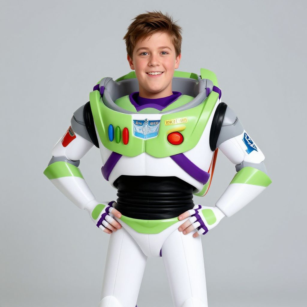 "buzz lightyear adult costume, 1boy, solo, hands on own hips, male focus, helmet, realistic, looking at viewer, smile, science fiction, spacesuit Realistic photo of casual sexy person with pretty face"