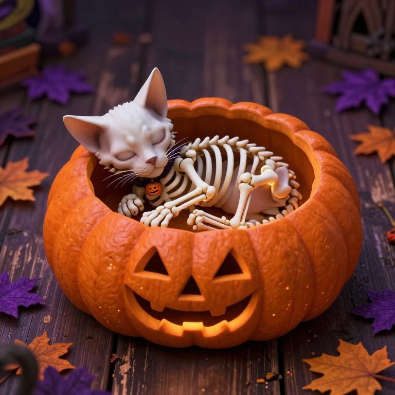 \"Create a hyper-realistic image of an adorable skeletal kitten curled up and sleeping in a cute Jack-O-Lantern cat bed, The kitten's skeletal body is intricately detailed, with delicate bones and joints that seem to glow with a soft, ethereal light, The Jack-O-Lantern bed is carved with a sweet, smiling face, and is surrounded by purple and orange autumn leaves that seem to be scattered about the haunted wooden floor, The floor itself is old and worn, with subtle cracks and grooves that suggest a long history of use and abuse, The kitten's collar is adorned with a small, shiny pumpkin emblem, which adds a touch of festive charm to the overall scene, Incorporate intricate details and textures to bring the kitten, bed, and surroundings to life, with a focus on capturing the sense of warmth and coziness that comes with a comfortable, autumnal scene