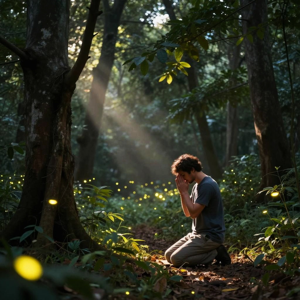 Man on knees praying in a lush green forest clearing, surrounded by glowing fireflies and ancient trees, gentle rays of sunlight piercing through leaves, tranquil and sacred moment