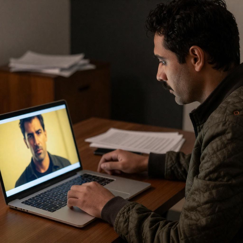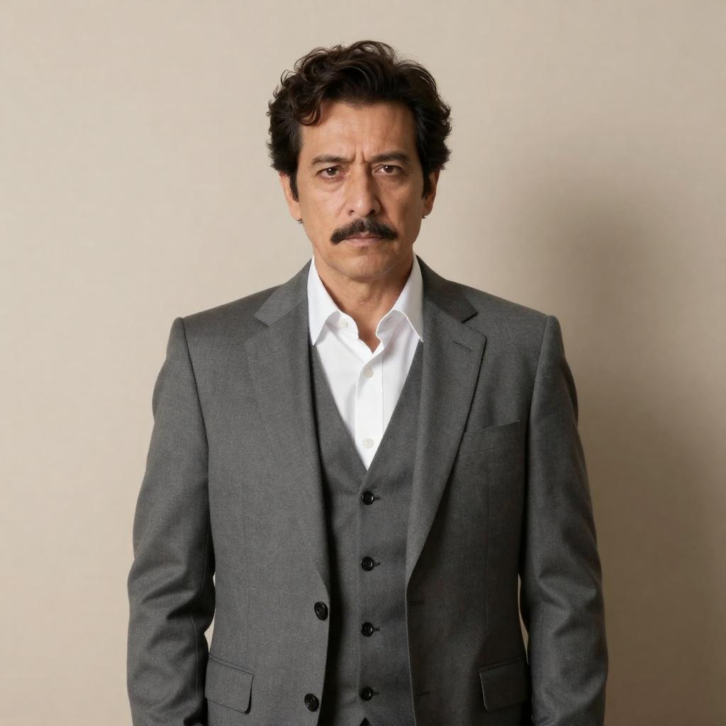 Two men in leather jackets, dark sunglasses, and patterned shirts stand in an ornate, warmly lit room. One man reflects in a mirror. Staircase with yellow railing in background. Both men have dark hair, goateats, and serious expressions. Mirror reflection shows same men. Wood carvings on right.