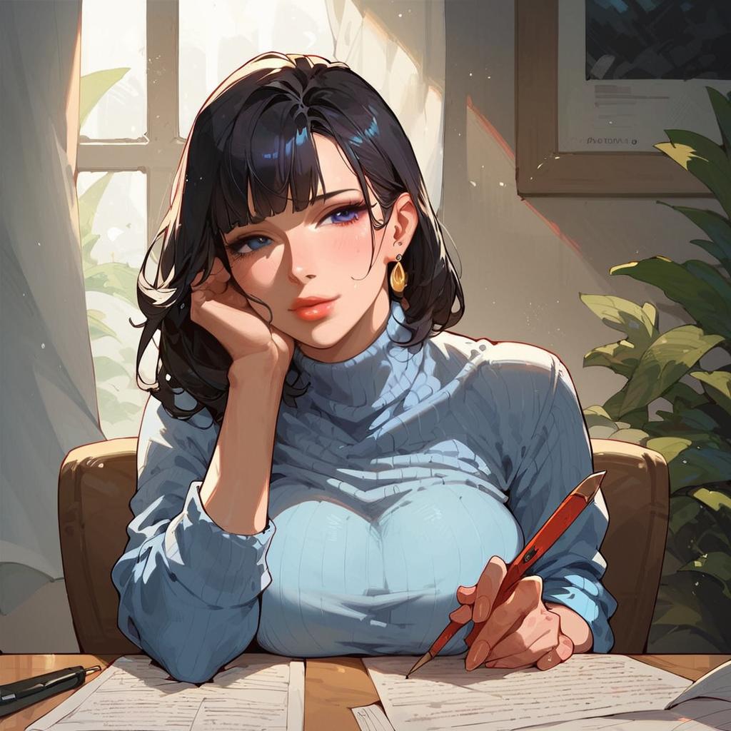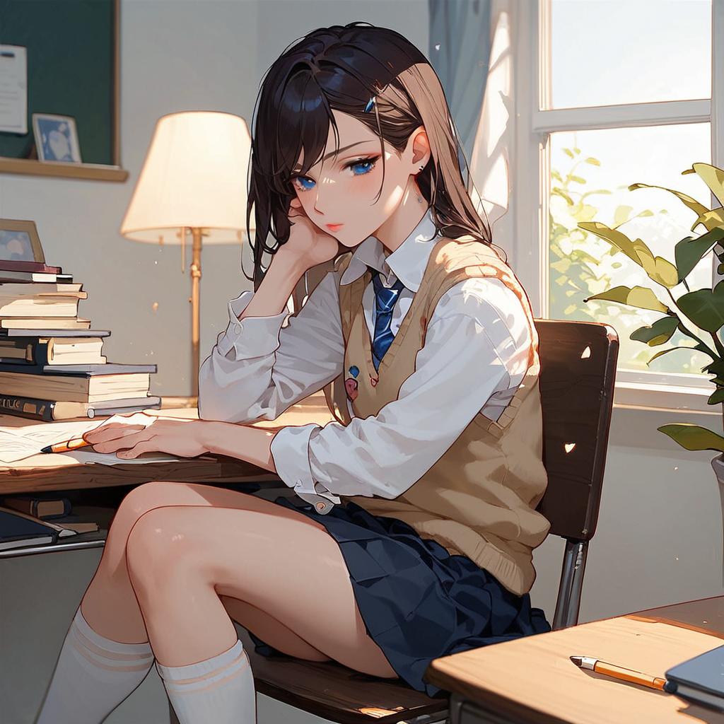 Score_9, score_8_up, score_7_up, peni parker, annoyed, bored, doing homework, holding a pencil, sitting at a desk, sitting on a chair, desk lamp, flat chest, skirt, shirt, school uniform, pleated skirt, necktie, socks, sweater vest, solo, rating safe, source anime
