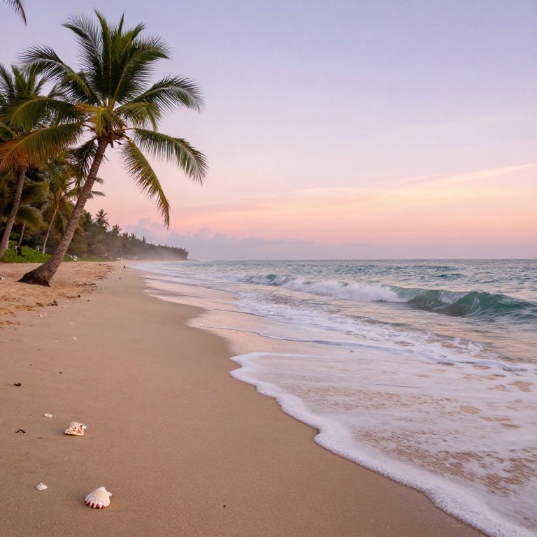 Natura calm beach at sunrise with gentle waves washing over smooth sand, palm trees swaying softly in the breeze, seashells scattered around, soft pastel sky blending pink and orange hues, tranquil and inviting atmosphere, high detail ocean view