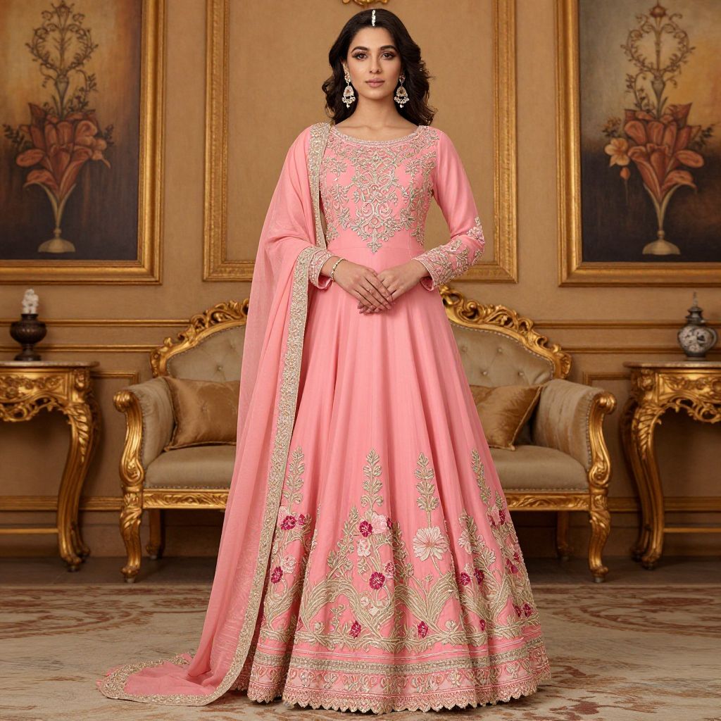 Elegantly poised woman wearing a vibrant pink bridal maxi dress with intricate floral embroidery and a flowing dupatta, set against an ornate backdrop featuring golden furniture and decorative wall art.