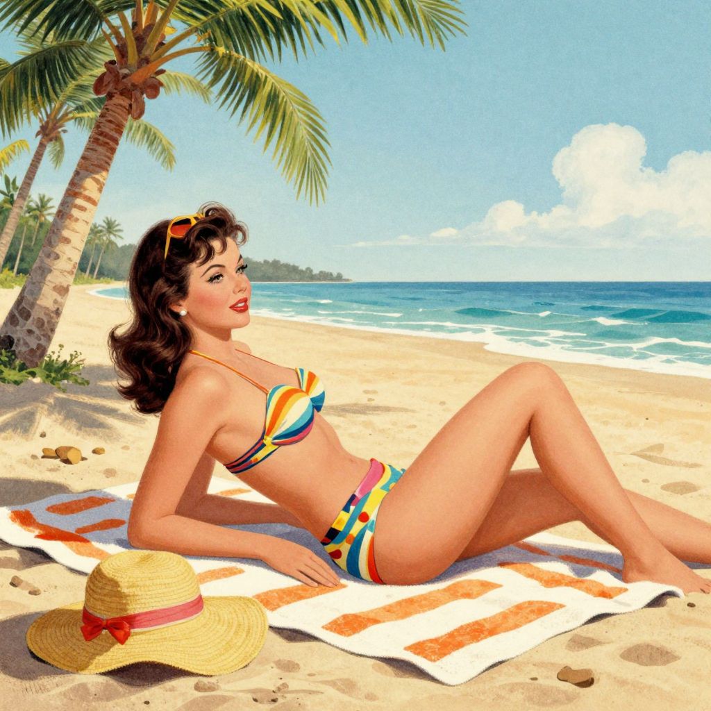 A vintage-inspired illustration reminiscent of mid-century American advertising art, featuring a woman lounging on a beach towel in a colorful bikini, surrounded by palm trees and a serene ocean backdrop, evoking the nostalgic charm of classic Saturday Evening Post cover art.