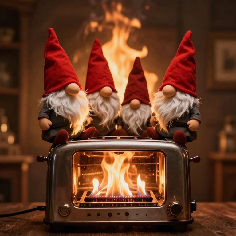 Photograph of three gnome figurines with red hats and white beards standing on a metallic toaster with a burning flame inside. Warm, cozy, and