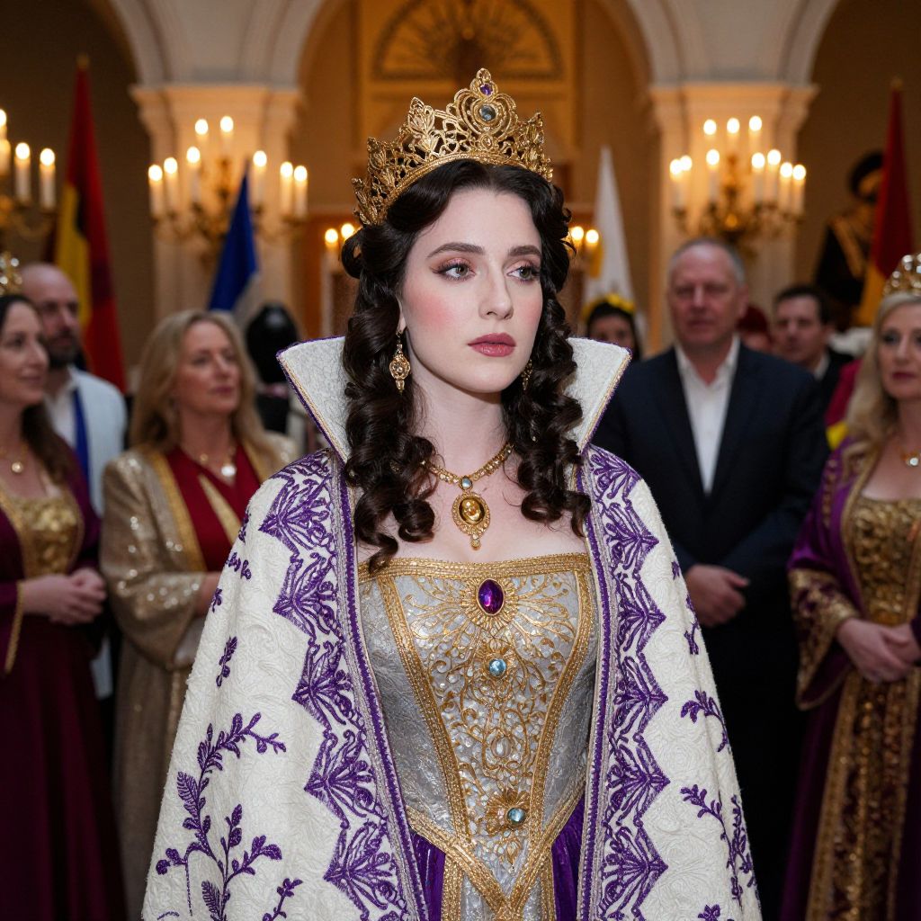 Queen Esther dressed in an elaborate Purim costume, including a jeweled gown, a white and purple embroidered shawl, and a crown of golden filigree, standing in a vibrant synagogue courtyard during the holiday celebration, her face is beautiful with fair skin, dark curls, and a thoughtful expression, surrounded by joyful community members in festive traditional wear, illuminated by warm candlelight