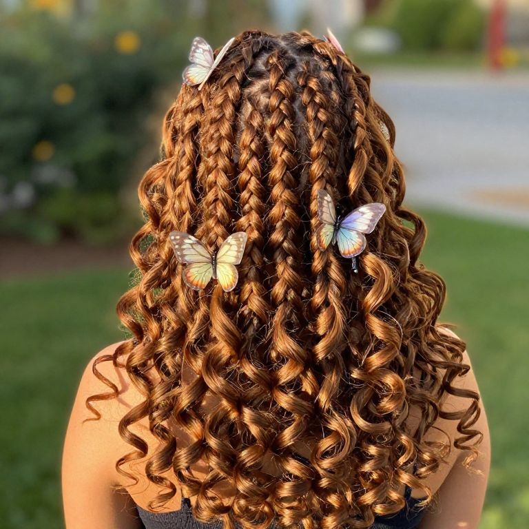 Butterfly locs medium length, vibrant natural hairstyle with soft curls and intricate twists, glowing sunlight highlighting rich brown tones, outdoor garden background, detailed strands and delicate butterfly-shaped hair accessories, soft focus, warm ambiance